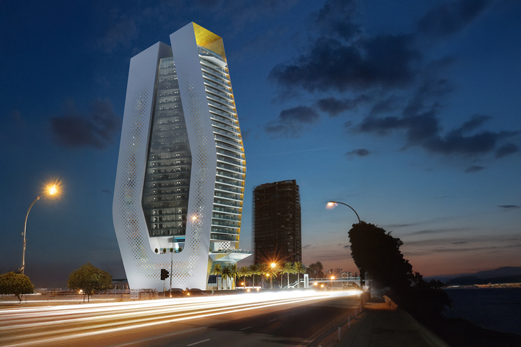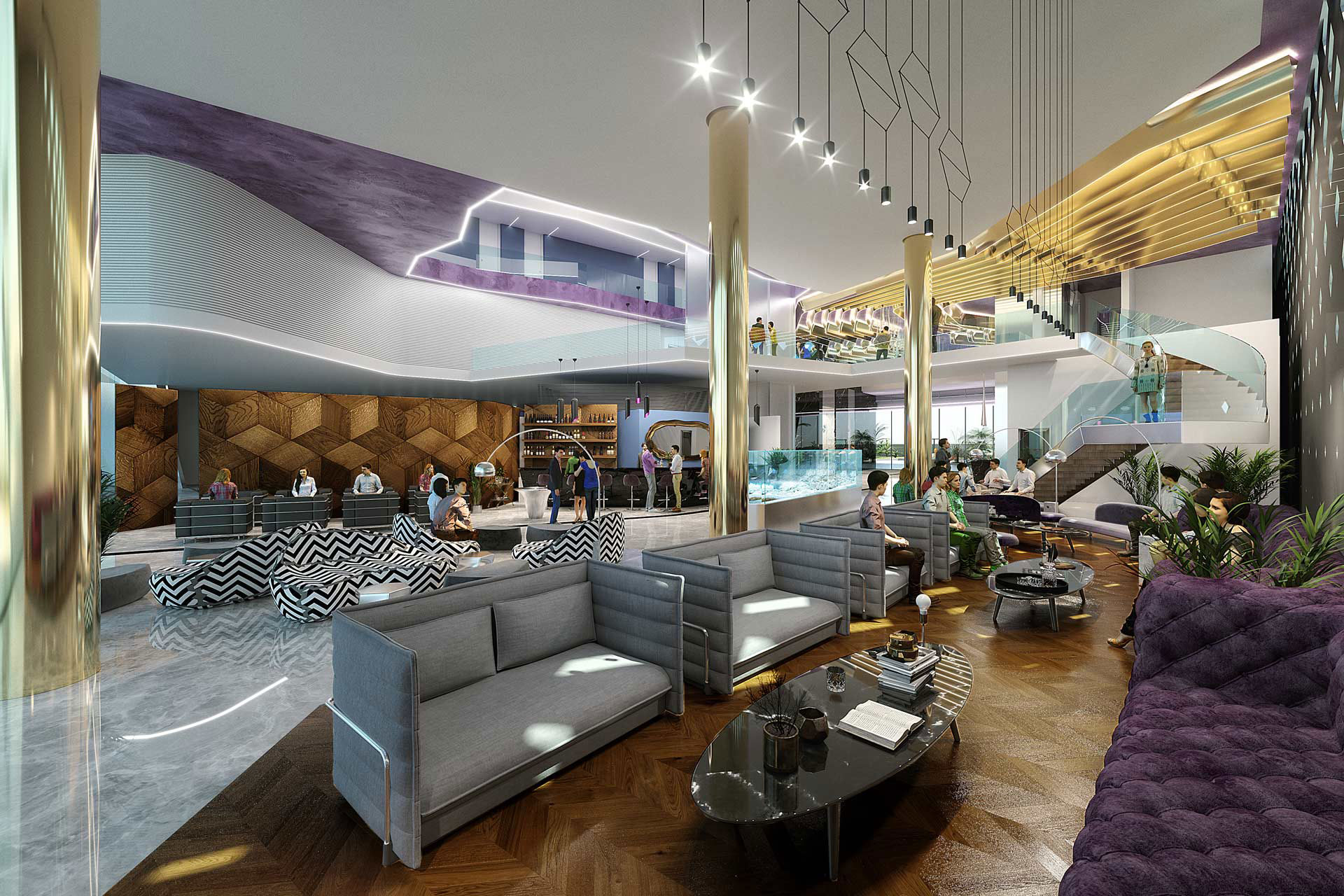 At the top of the hotel is a penthouse which features double height ceilings and has views to the sea. A newly designed bridge was also suggested to help inhabitants cross from the hotel to the beach. Inside, the lobby and the ground floor are made with a double height ceiling. Marble interiors feature throughout, evoking a luxurious experience for guests. And on the ground level there is also a bar.