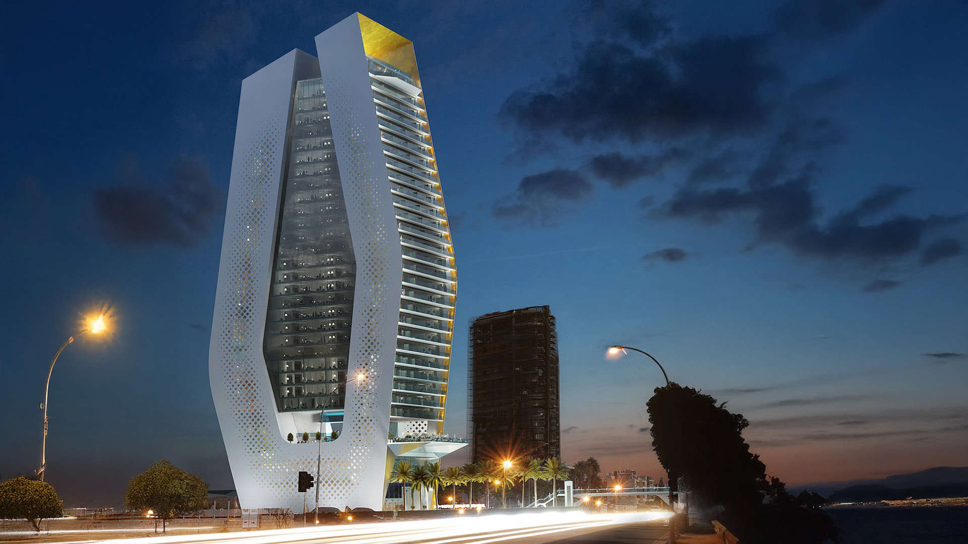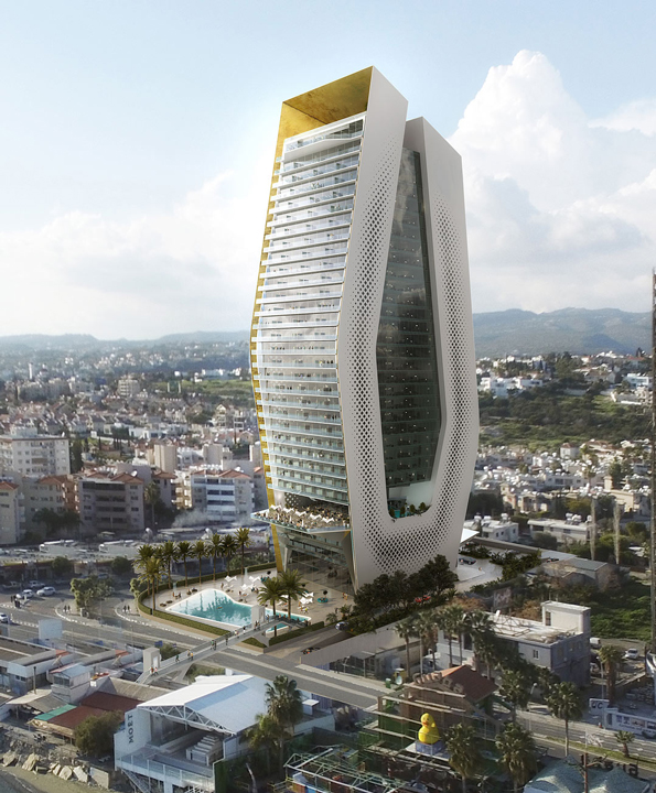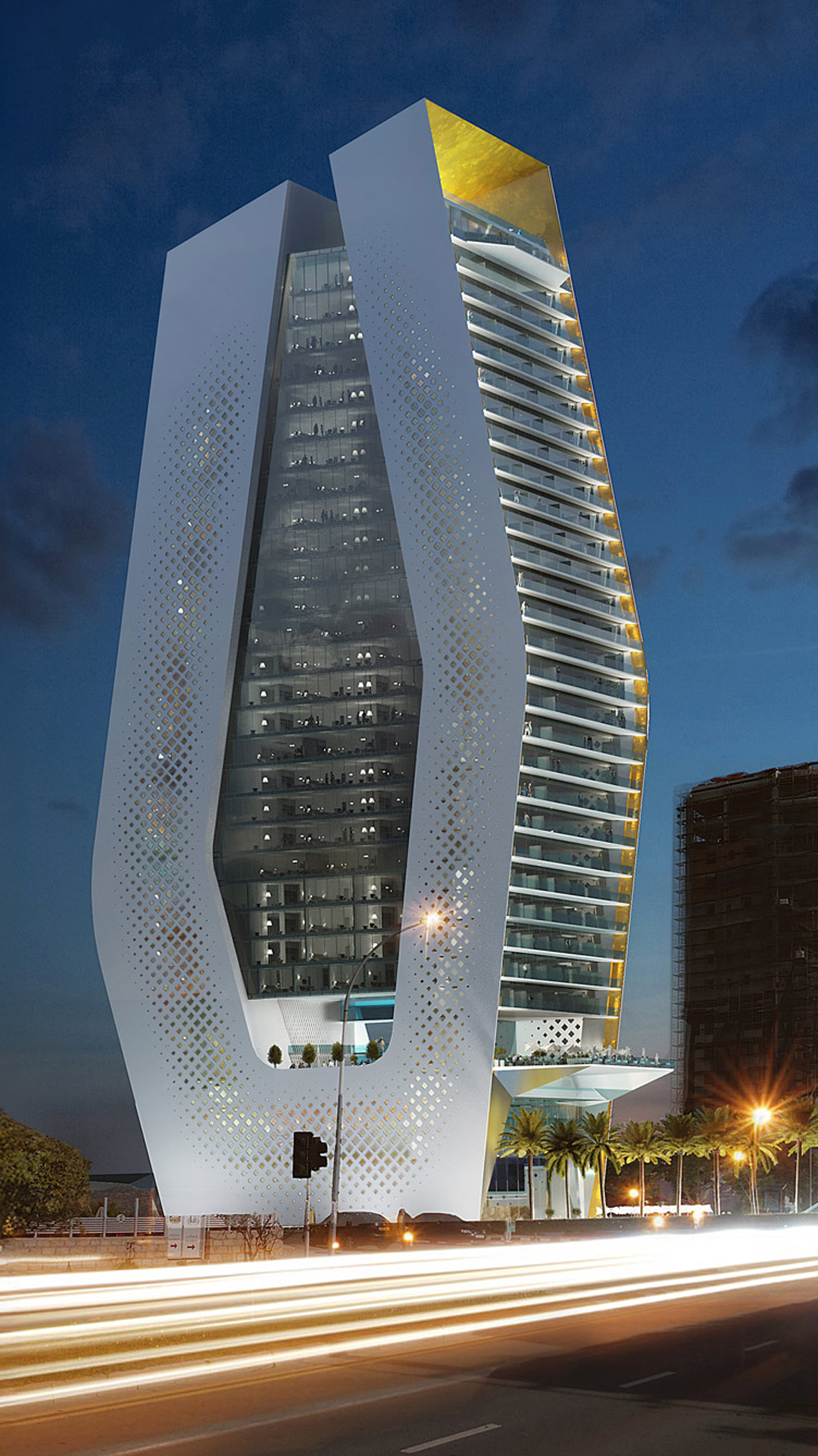 The concept was inspired by the shape of a classical Cyprian Lyre, evoking ancient history and speaking to the cultural energy that the hotel would house. The expressive structure sees juxtaposed panels soar above the building’s roof. The gold facade is lit up from inside of the skin, and contrasts with the white exterior. The facade is also perforated, enabling guests and residents to have views throughout the building.