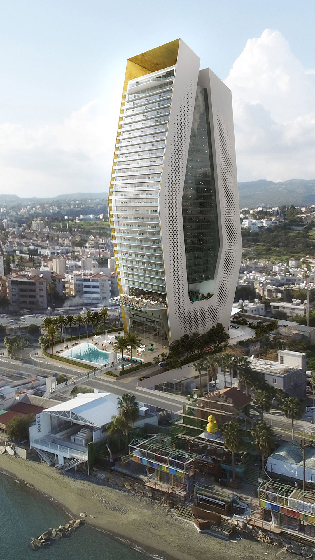 Set back from the waterfront of Limassol in Cyprus, this hotel and serviced apartments presents as a monolith for modern times, and is strikingly distinguished from its surrounding environment.