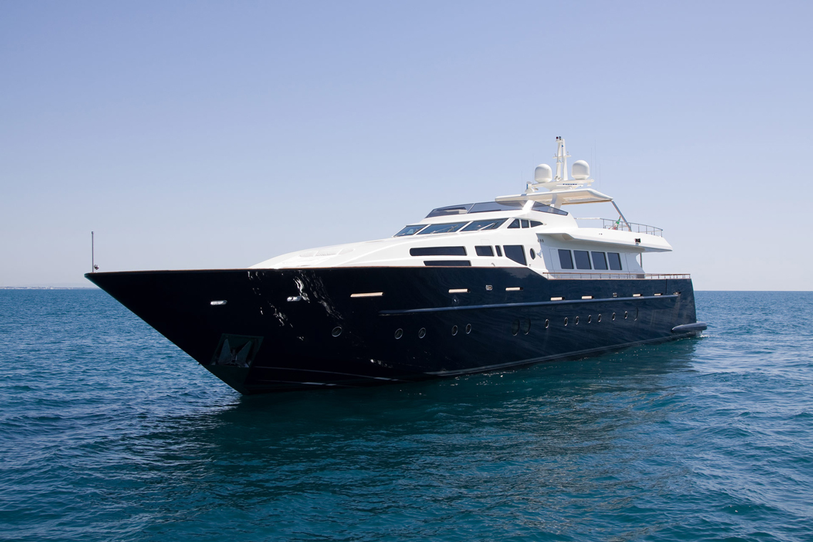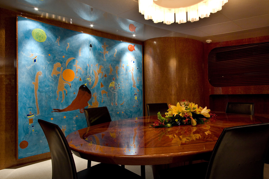 Built in Viareggio, Italy at the Tecnomar shipyard, the yacht features 1 Master Cabin, 5 Guest Cabins, 4 Crew Cabins. The cabins, a living room, dining room and staff areas and sits across three levels: the lower deck, where the owner’s, visitors’ and crew cabins are located; the main deck where the living room and dining room are located; and the wheel house, which is located between the main deck and the sun deck. Great care was taken to ensure separate living areas and passages for the staff and the guests.