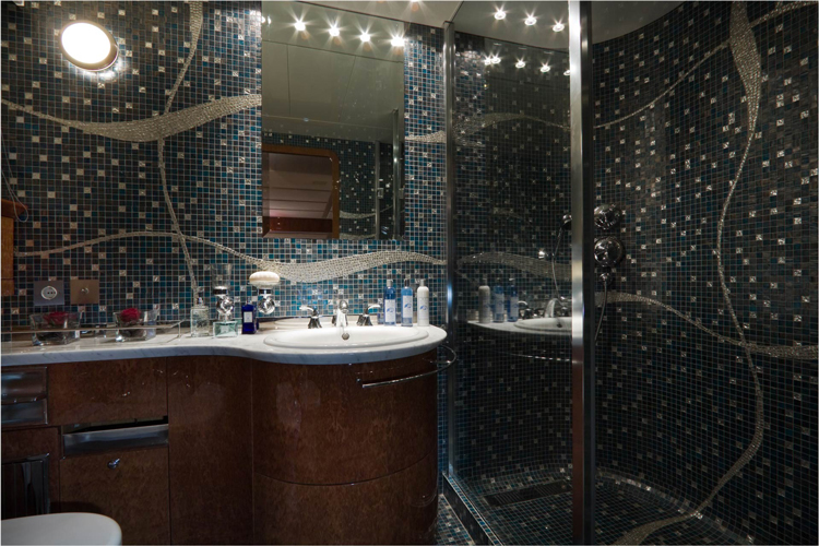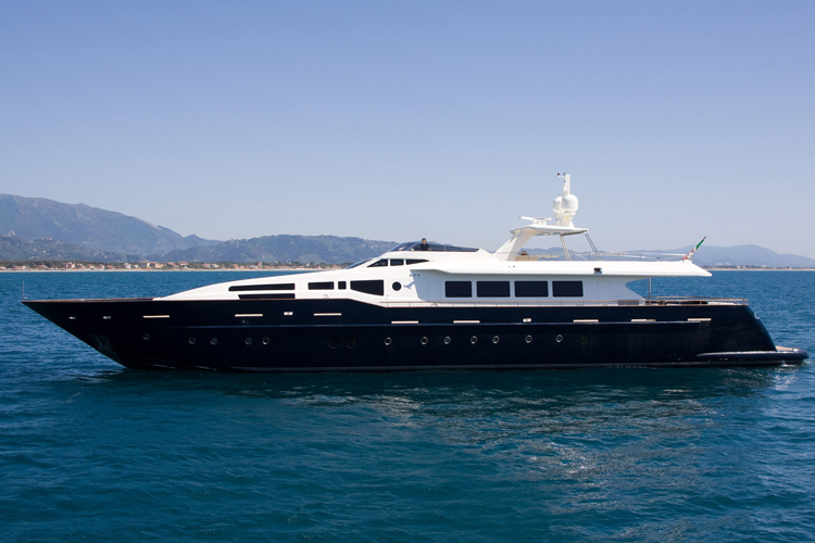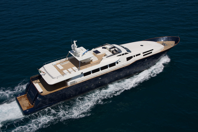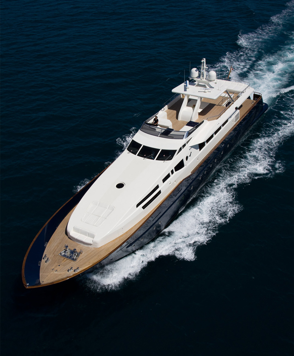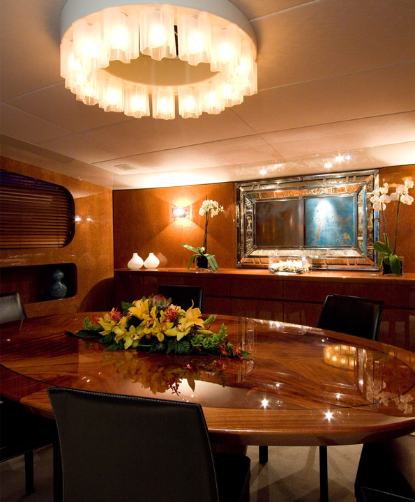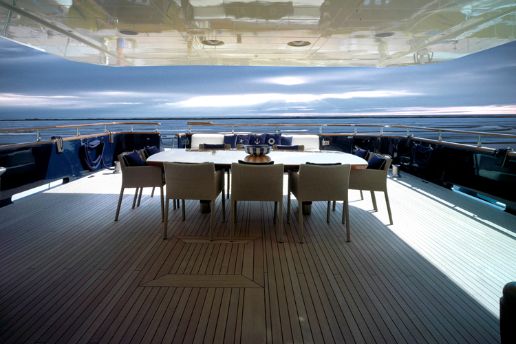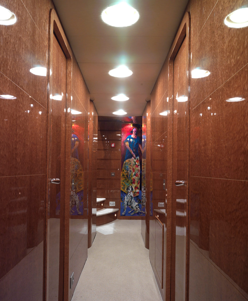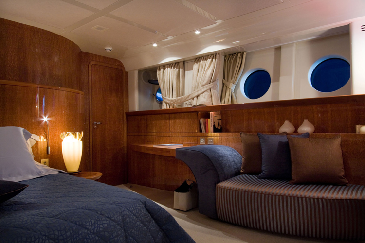 Built in Viareggio, Italy at the Tecnomar shipyard, the yacht features 1 Master Cabin, 5 Guest Cabins, 4 Crew Cabins. The cabins, a living room, dining room and staff areas and sits across three levels: the lower deck, where the owner’s, visitors’ and crew cabins are located; the main deck where the living room and dining room are located; and the wheel house, which is located between the main deck and the sun deck. Great care was taken to ensure separate living areas and passages for the staff and the guests.