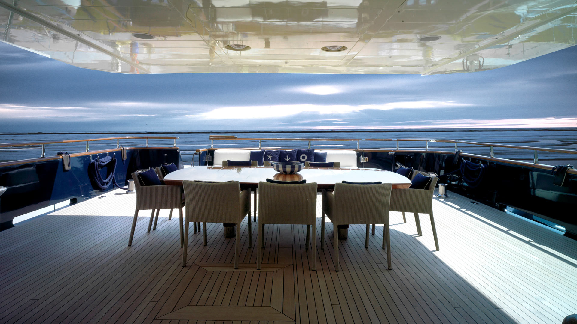 A key point of consideration for the exterior design was to ensure that, without a fixed point of orientation, the openings of the yacht would prevent intrusion of sunlight from all sides at all times. Circular windows were placed in all areas of the lower deck with a 35cm diameter, with visible stainless steel frames. For the sun deck, a multipurpose composite element was conceived as a table which also supported the installation of the mast, and provided shade for the table.