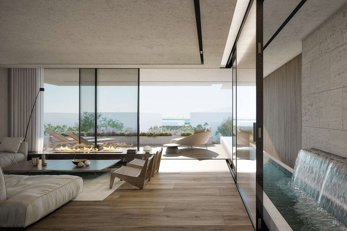 A harmonious interplay between the hard and soft material also emphasises wellbeing, with stone and wood cladded exteriors juxtaposed with water elements. Apartments on the ground floor and third floors feature private swimming pools, while apartments on the second floors are equipped with statement water features. On the ground level apartments, expansive, double-height glass windows flood interiors with light.