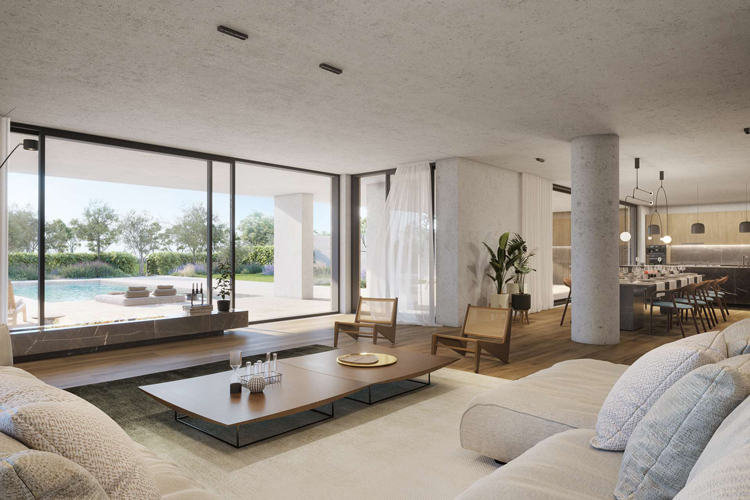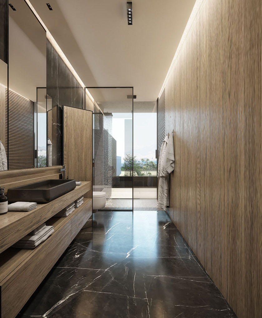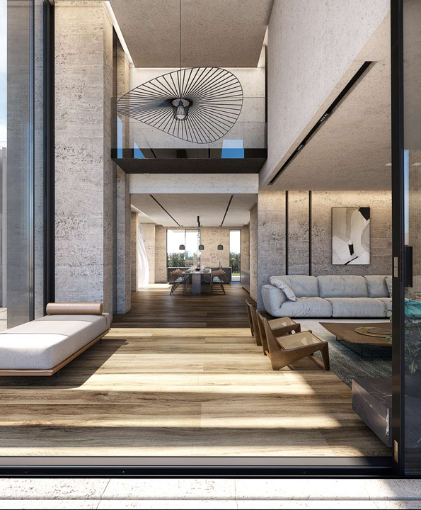 A harmonious interplay between the hard and soft material also emphasises wellbeing, with stone and wood cladded exteriors juxtaposed with water elements. Apartments on the ground floor and third floors feature private swimming pools, while apartments on the second floors are equipped with statement water features. On the ground level apartments, expansive, double-height glass windows flood interiors with light.