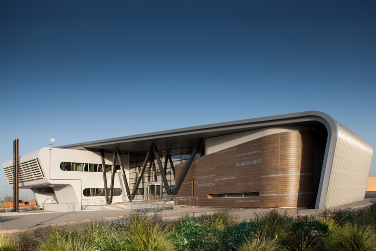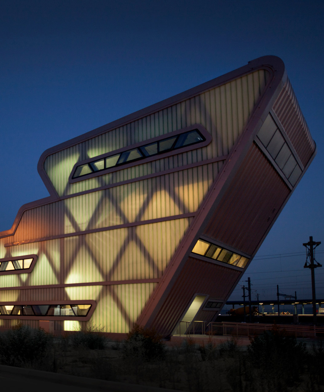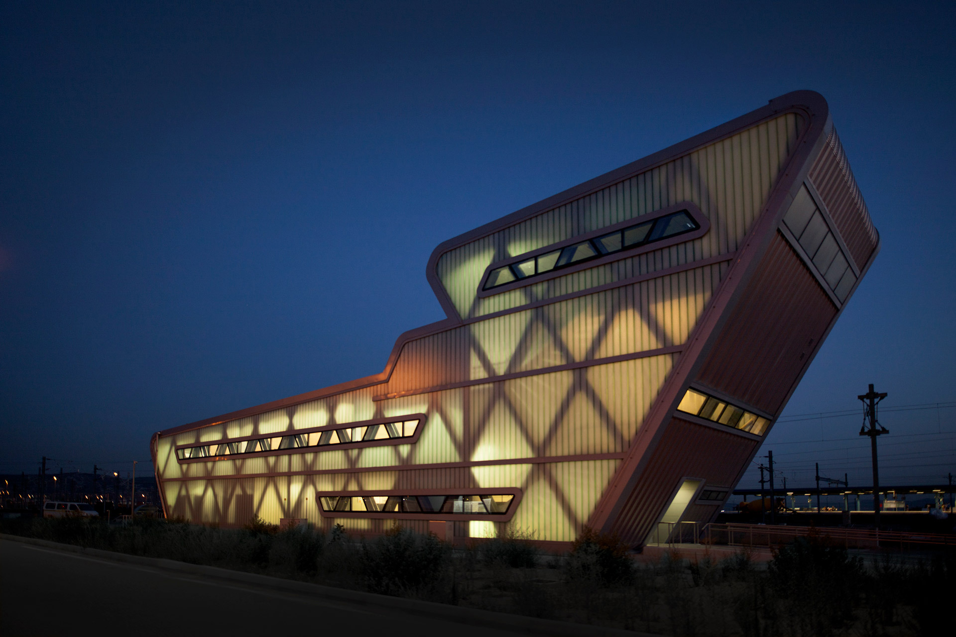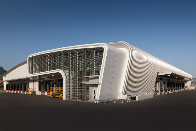 From the highest level, the control tower offers panoramic views around the site, while the lower level is used as office space. The expressive, organic form of the control tower is created with semi opaque material, revealing the structural lattice element that lies underneath. The head office is enveloped by a central aluminium panel system and features wooden cladding. And the low-slung hangar features a gently arcing roof, serving as the central point for loading and unloading, with train tracks and lorries intersecting at the heart of the building.