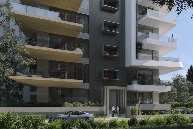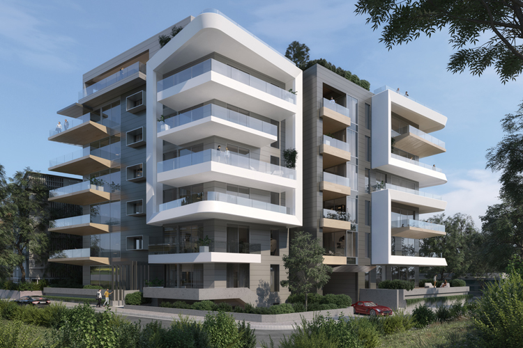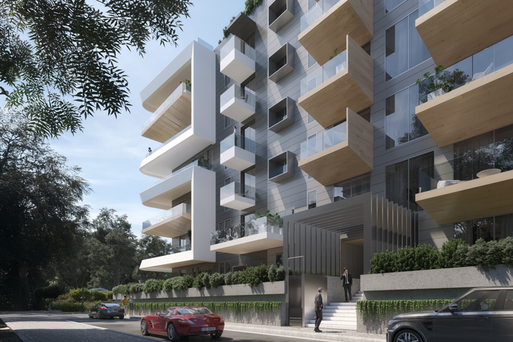 Consisting of 46 apartments, the building envelope is made from aluminium and stone cladding on honeycomb panels. Giving the building a distinct structural identity, extruding white aluminium panels bookend either side of the apartment, framing the balconies enclosed within. The ground floor is raised to facilitate lake views for the apartments, with privacy maintained through a wall of greenery. And the entrance is marked with a distinctive series of aluminium arches that emphasise the separation between private and public space.