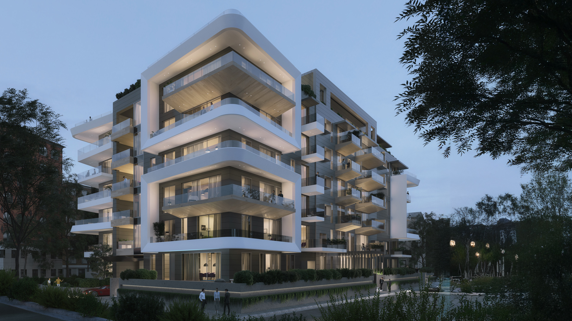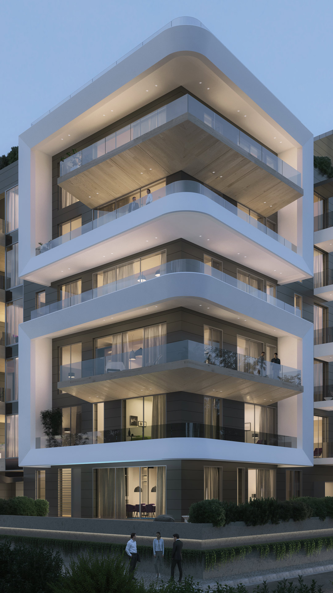 Envisioned as luxury private residences, there is an emphasis on discretion.Each apartment is carefully protected from another through enclosed wooden balconies, while extruding shells around windows punctuate the linearity of the building facade and separate apartments from each other. While privacy is maintained, all apartments have undisrupted views. On the roof, a penthouse apartment features a private swimming pool, and there is also a communal roof terrace for residents to enjoy spectacular lake views.