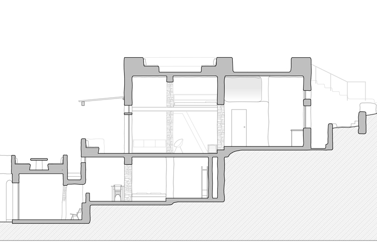 The lower level, the katoi, originally housed animals and also featured a winepress. Upstairs, the anoi, was the central domestic area. These two spaces were, and continue to be, separated over two floors and connected by an external staircase. These historical uses created an opportunity for invention. On the upper level, key details, such as the addition of a mezzanine floor supported by a metal beam, introduced an additional open-plan bedroom. Downstairs, the area which formerly housed the winepress has been transformed into bed with storage space. All the while original details, such as the beams, were preserved.