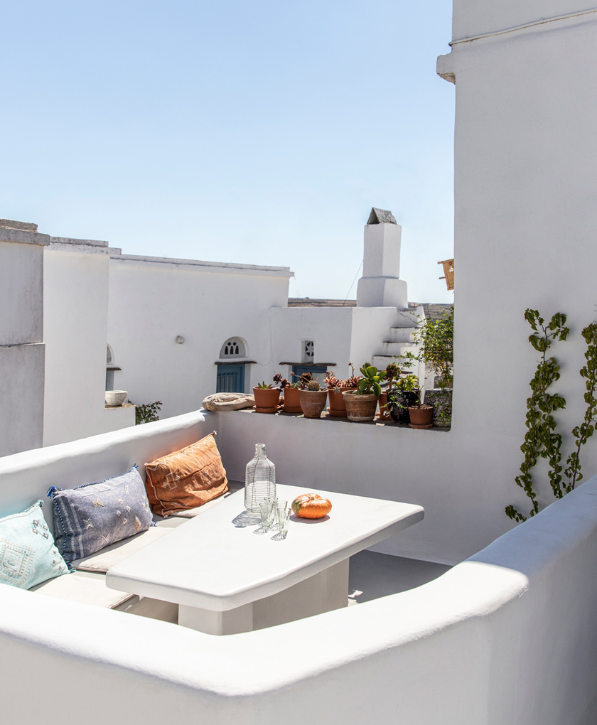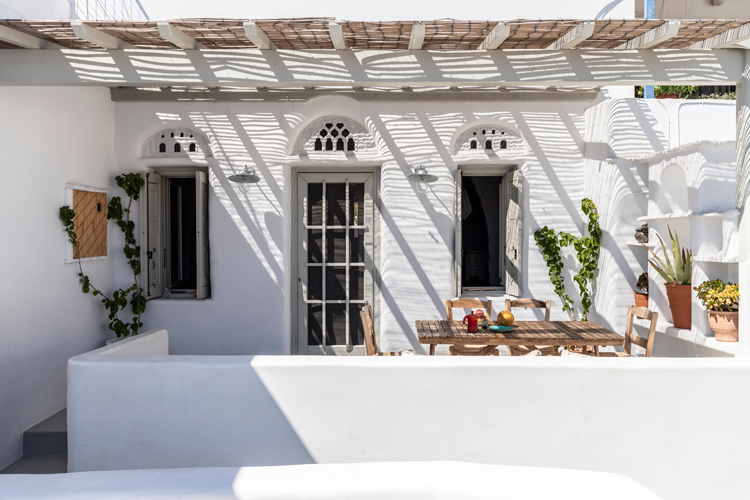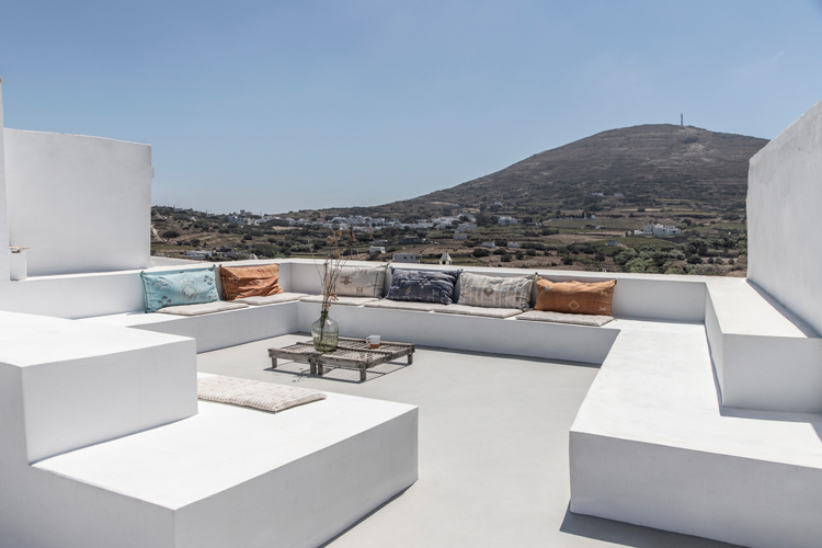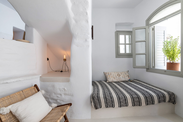 The renovated home features a long kitchen, with the original wooden stove modernised to pipe warm air throughout the house during winter. Meanwhile a small herb garden houses thyme, lavender, tomatoes – within easy reach of the kitchen. From the garden there is also access to the roof, with views towards the nearby Exomvourgo Venetian Castle.