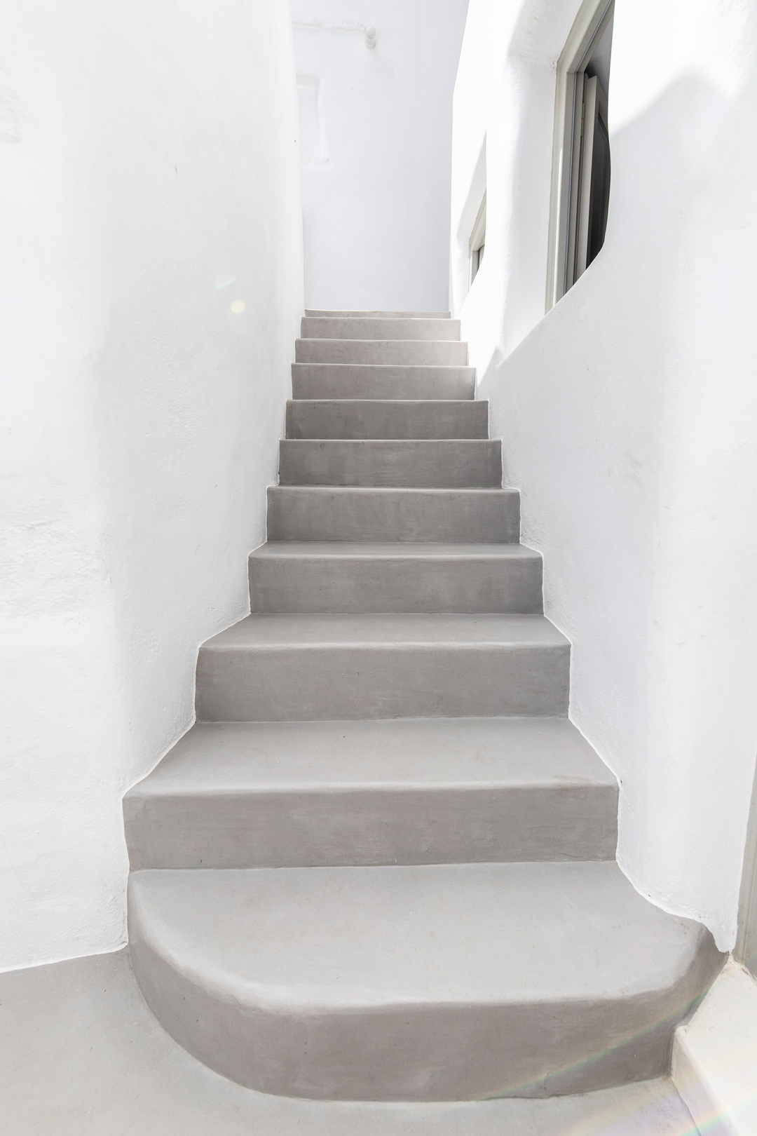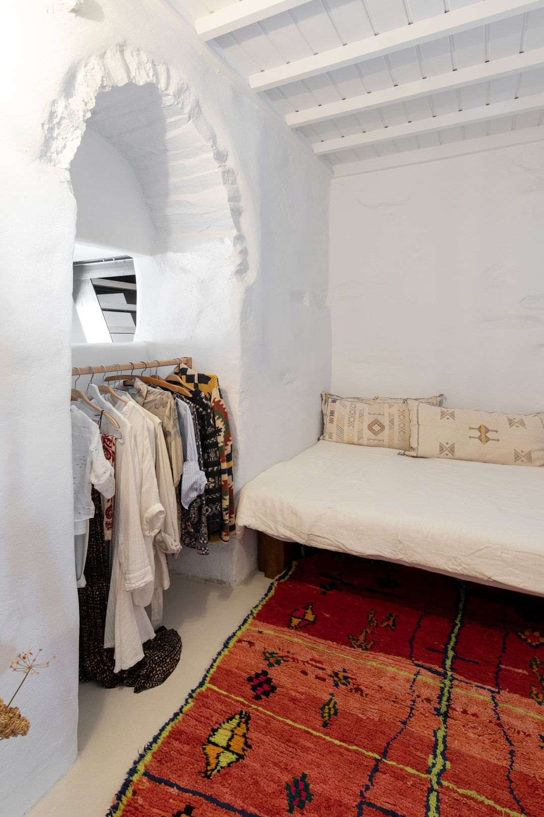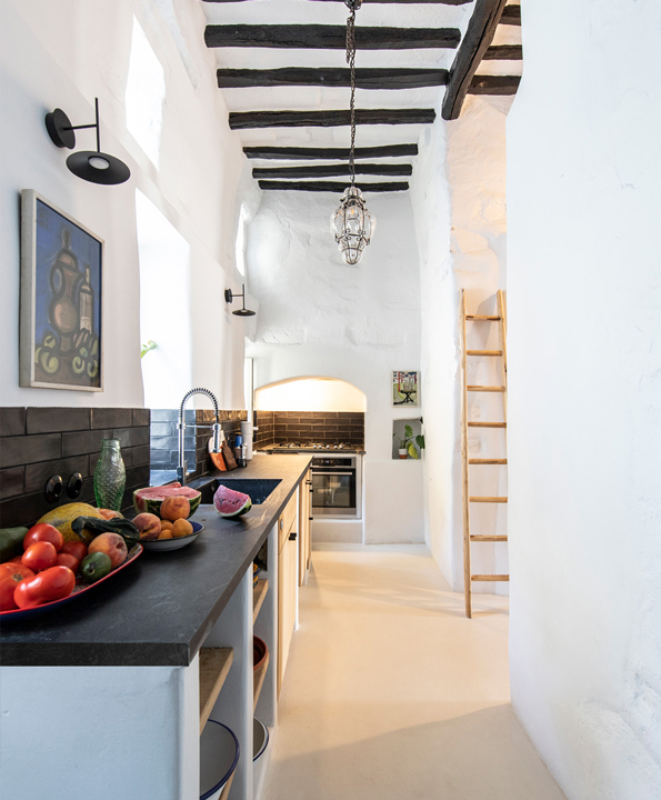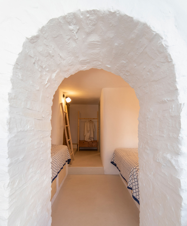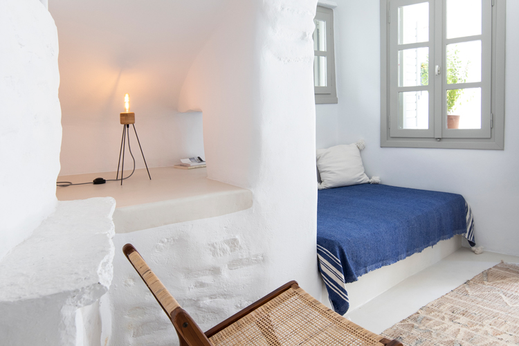 The lower level, the katoi, originally housed animals and also featured a winepress. Upstairs, the anoi, was the central domestic area. These two spaces were, and continue to be, separated over two floors and connected by an external staircase. These historical uses created an opportunity for invention. On the upper level, key details, such as the addition of a mezzanine floor supported by a metal beam, introduced an additional open-plan bedroom. Downstairs, the area which formerly housed the winepress has been transformed into bed with storage space. All the while original details, such as the beams, were preserved.
