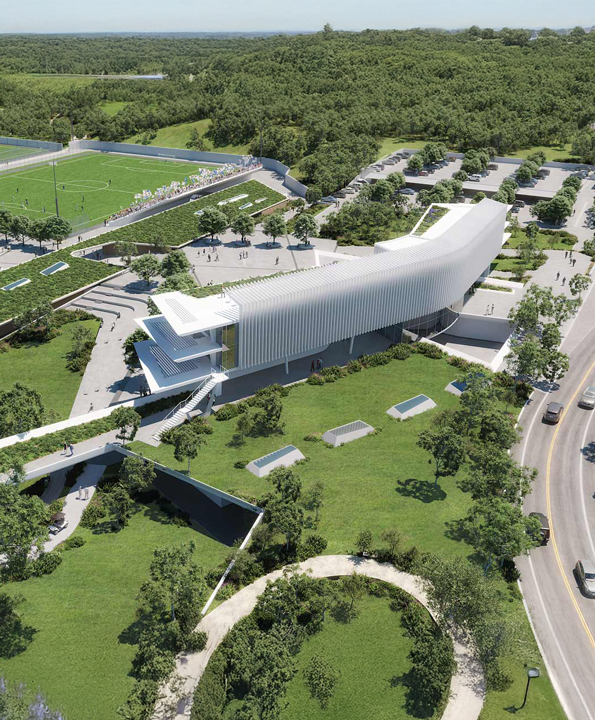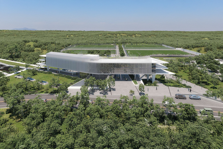 The central pavilion is created from a combination of steel and concrete, overlaid with steel honeycomb panels. Angular in composition, evenly proportioned louvre elements provide a complex shading system for spectators. The main viewing area is enclosed by greenery, establishing a tranquil environment to observe the surrounding activity. A tree-lined plaza also foregrounds the entrance.