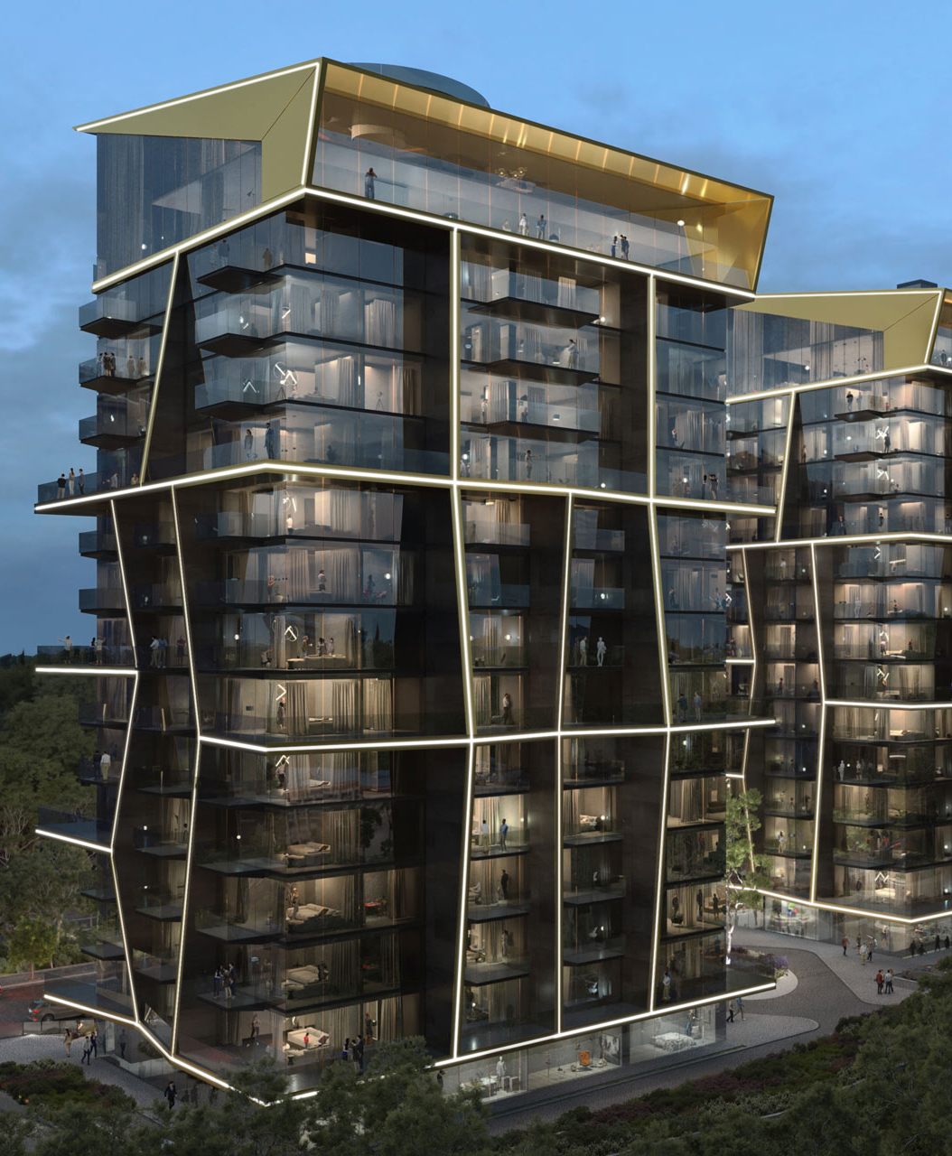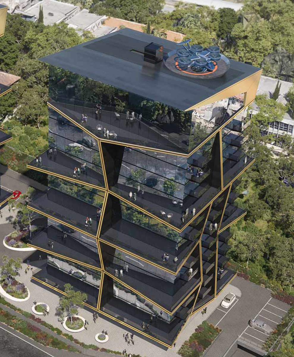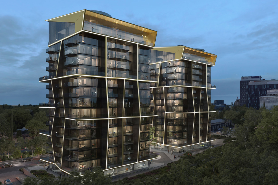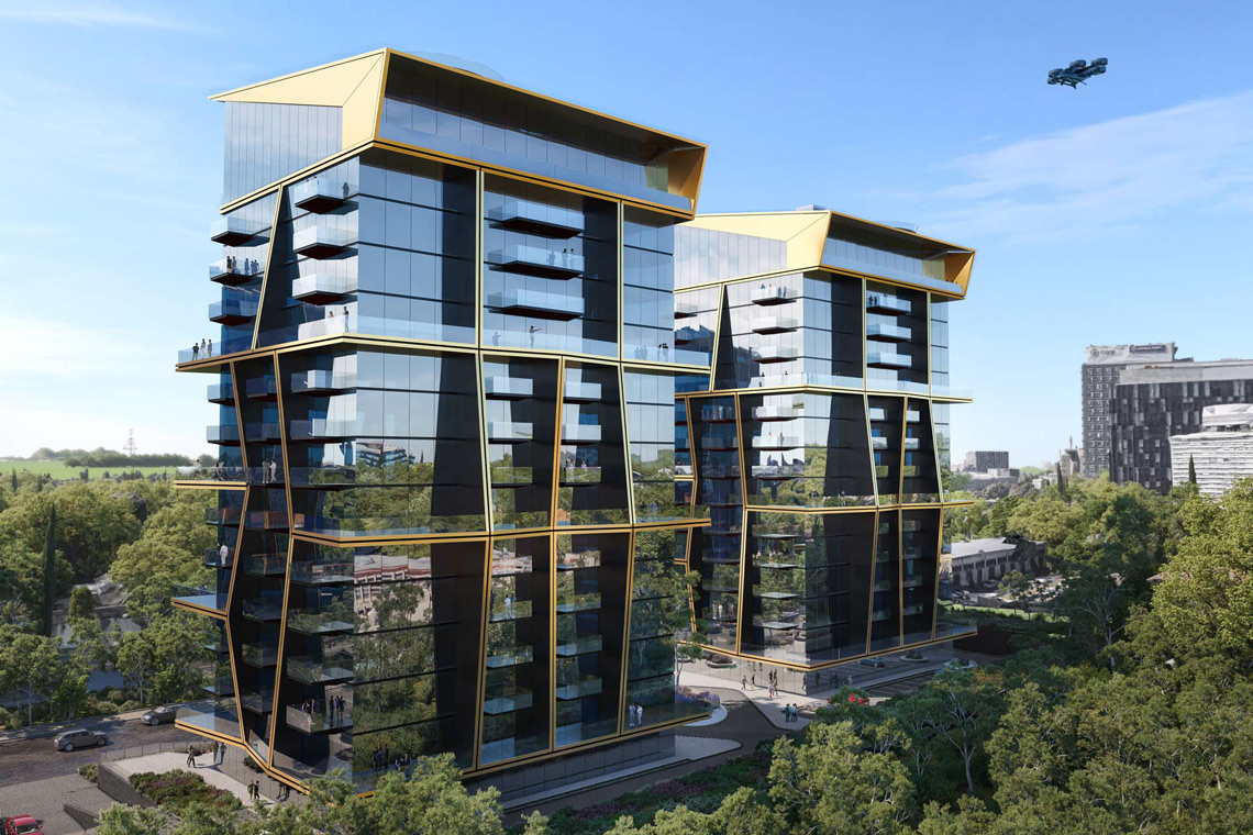 Notable for each design is the roof terrace, which plays host to a drone landing pad – a cutting edge offer for luxury-minded residents looking for a swift route in and out of their home to the environs of the city. The second tower of the project also includes two spectacular swimming pools that sit adjacently at the centre of the bridge, between the two buildings. Reflecting the dynamism of its inhabitants, the overall unity of the building is achieved through the energetic meeting of gold finish aluminium across the glass facade.