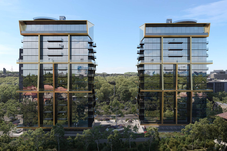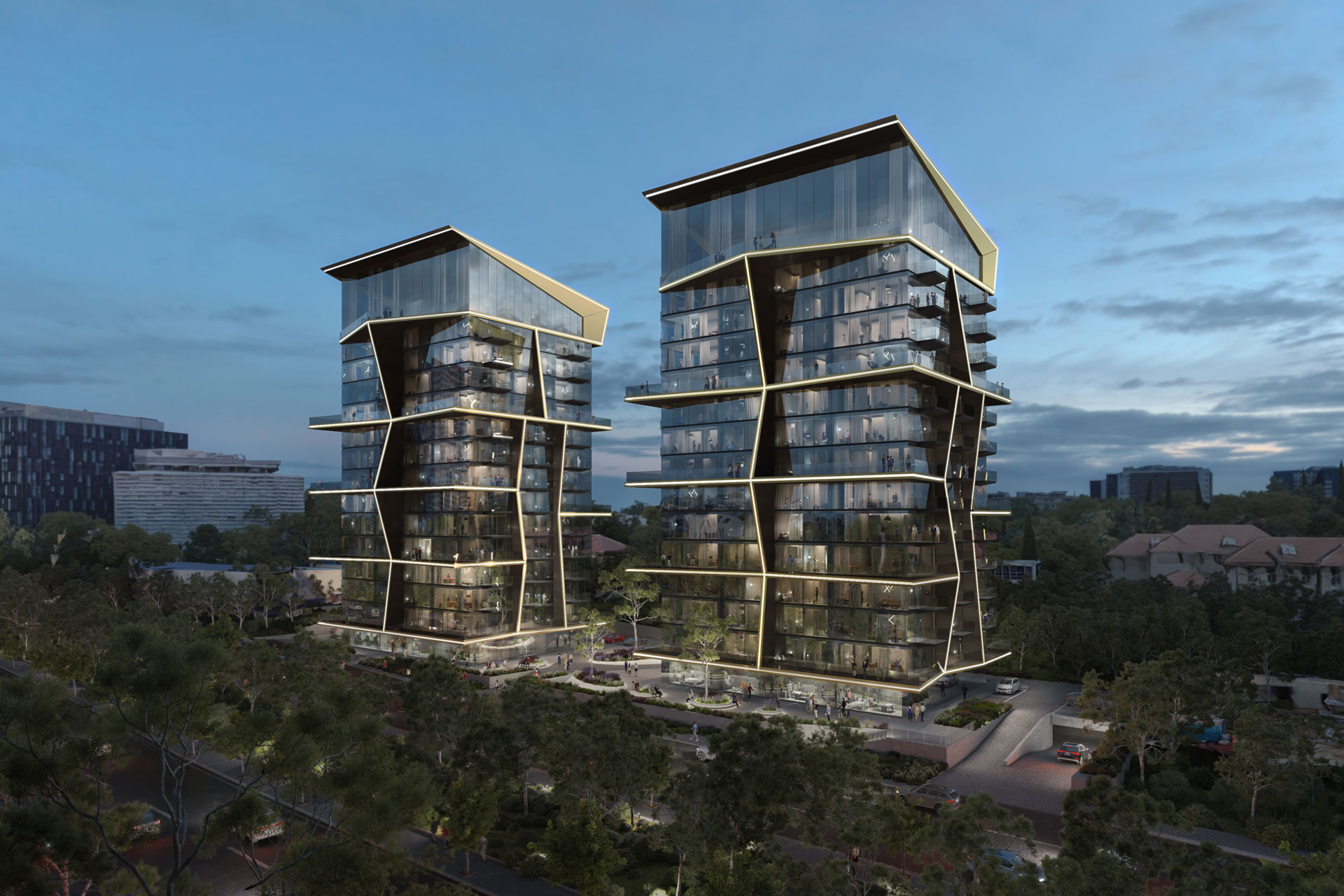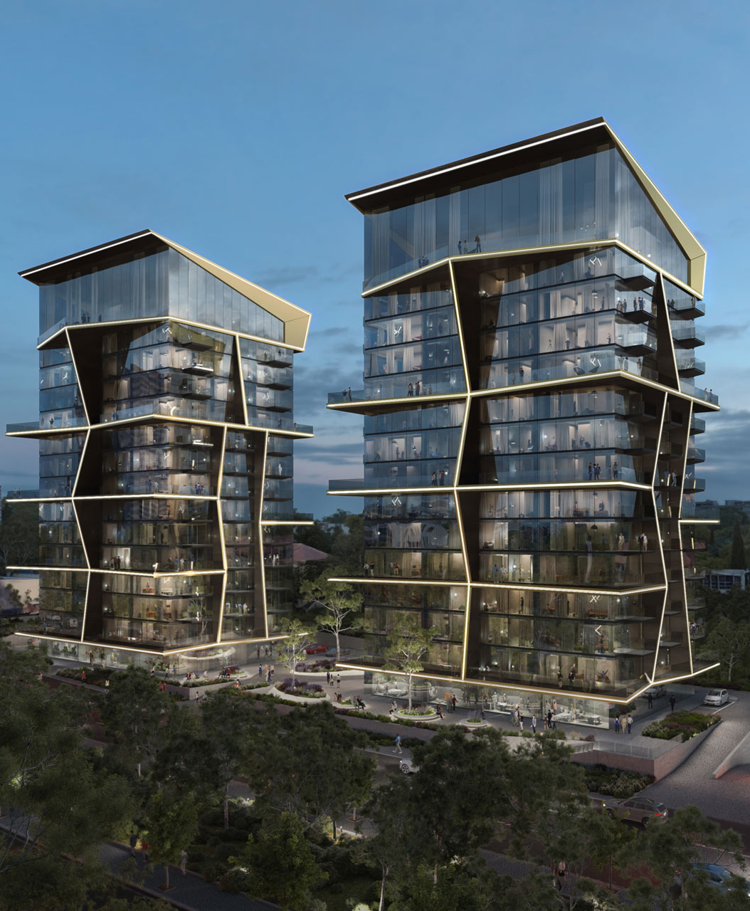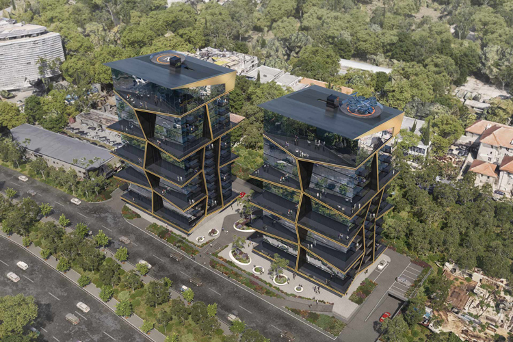 Notable for each design is the roof terrace, which plays host to a drone landing pad – a cutting edge offer for luxury-minded residents looking for a swift route in and out of their home to the environs of the city. The second tower of the project also includes two spectacular swimming pools that sit adjacently at the centre of the bridge, between the two buildings. Reflecting the dynamism of its inhabitants, the overall unity of the building is achieved through the energetic meeting of gold finish aluminium across the glass facade.