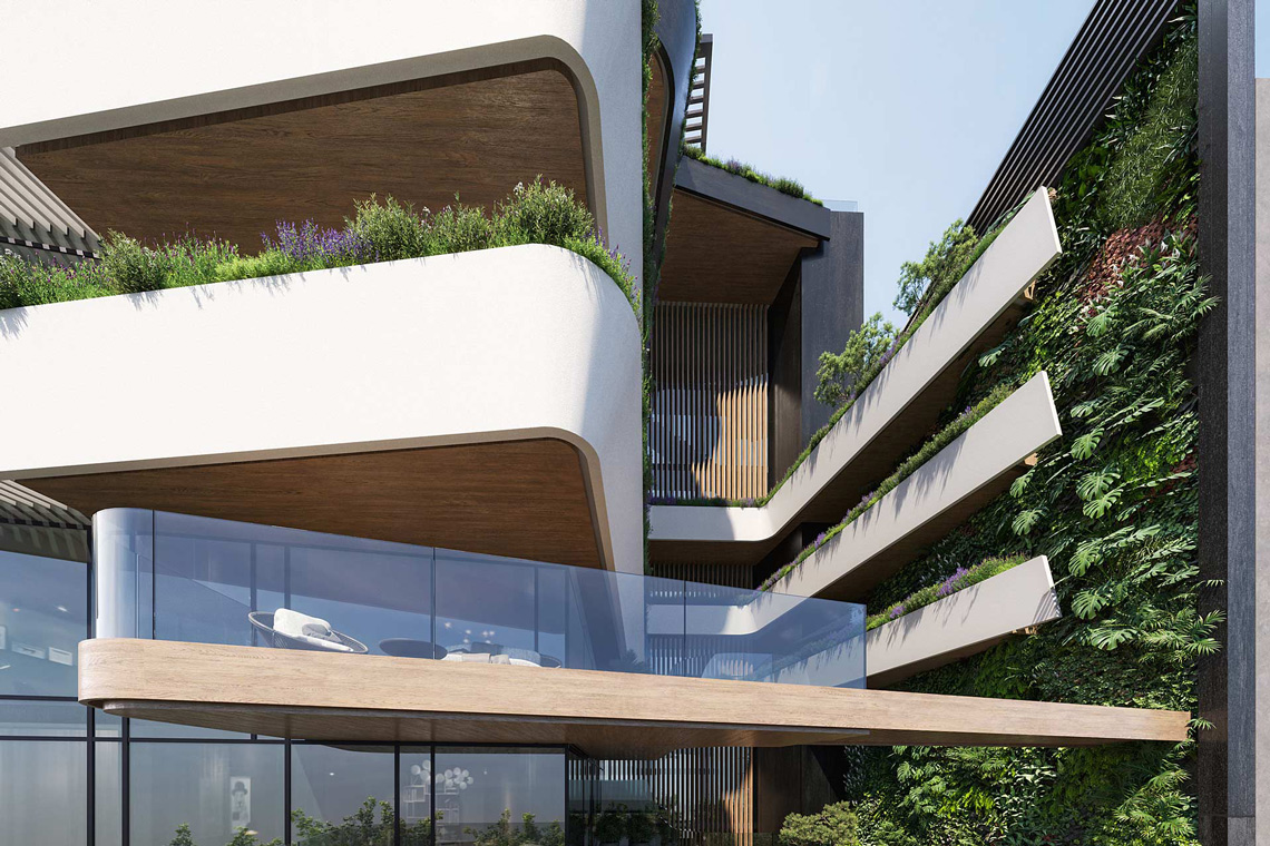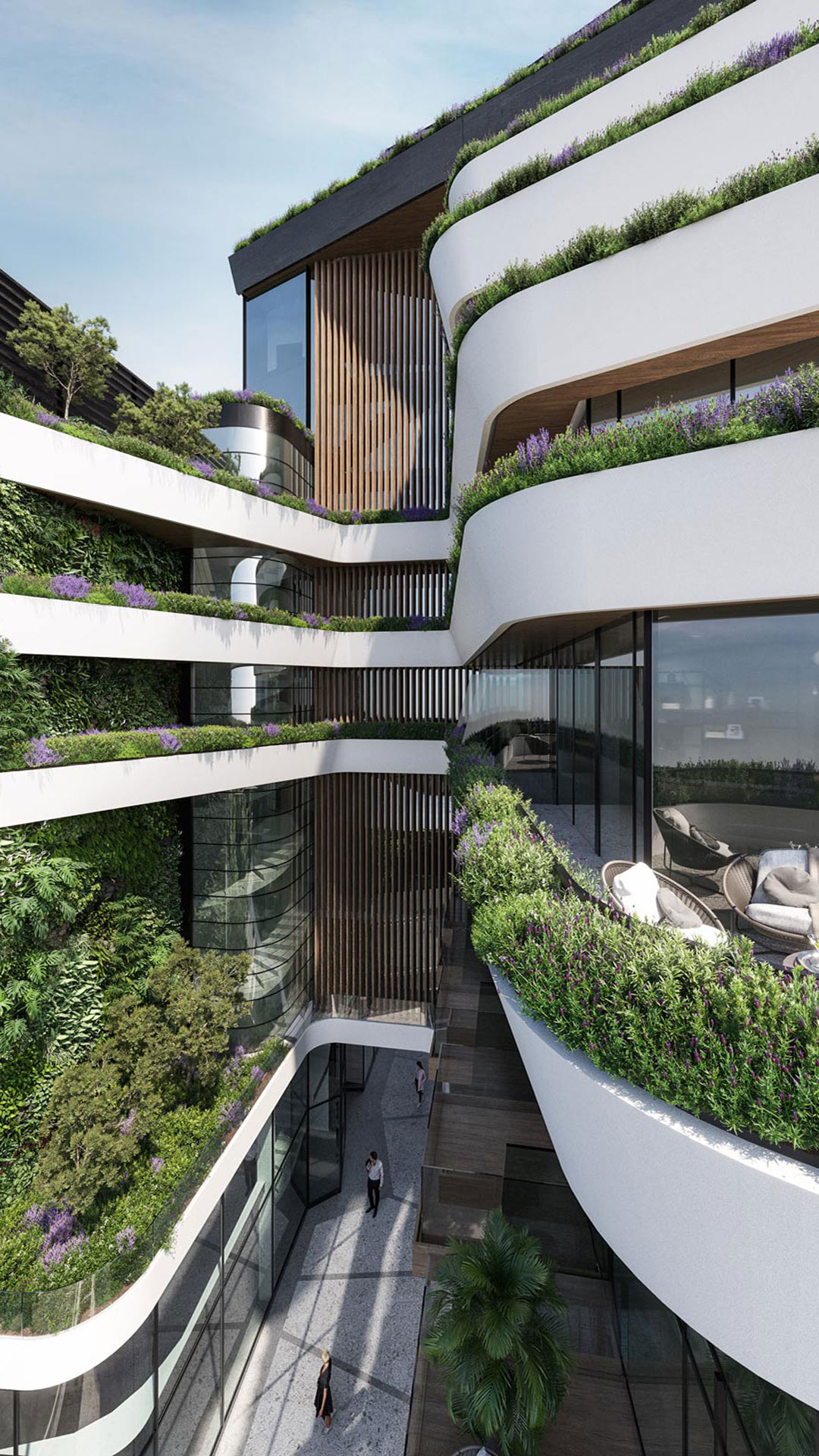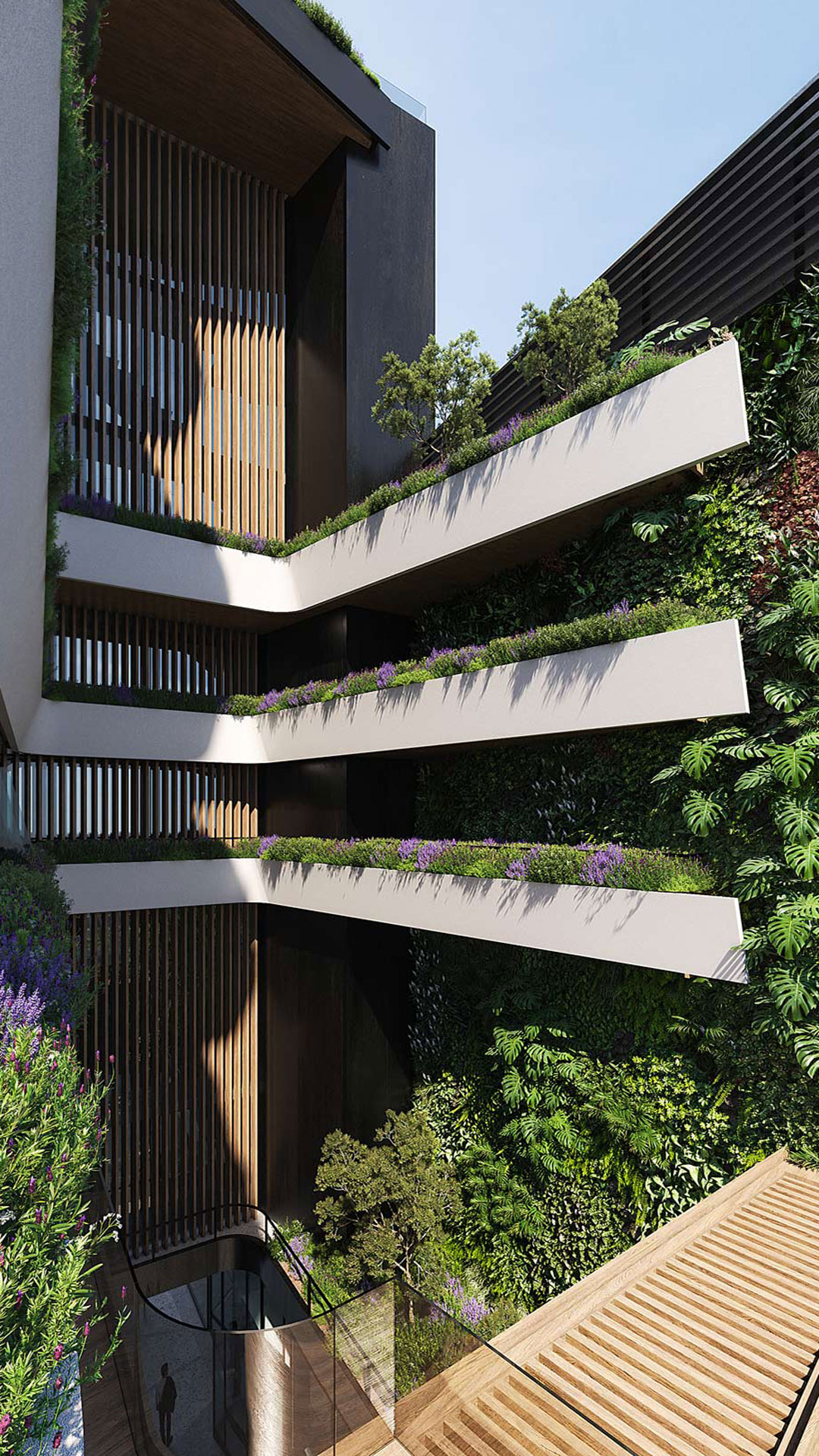 Featuring both apartments and commercial areas, a priority was to ensure that everyone in the building had an open view from their apartment. Biophilic design was central to delivering this, with key features such as the creation of a vertical garden ensuring direct experiences of nature. The other key focus was to ensure privacy for each resident. As such, vertical wooden slats provide shading for the communal area from the street, and staggered tilted balconies protrude from each level and also protect from street views.