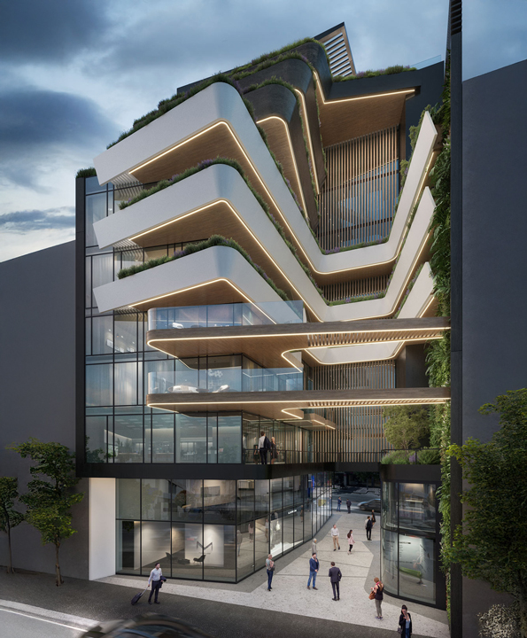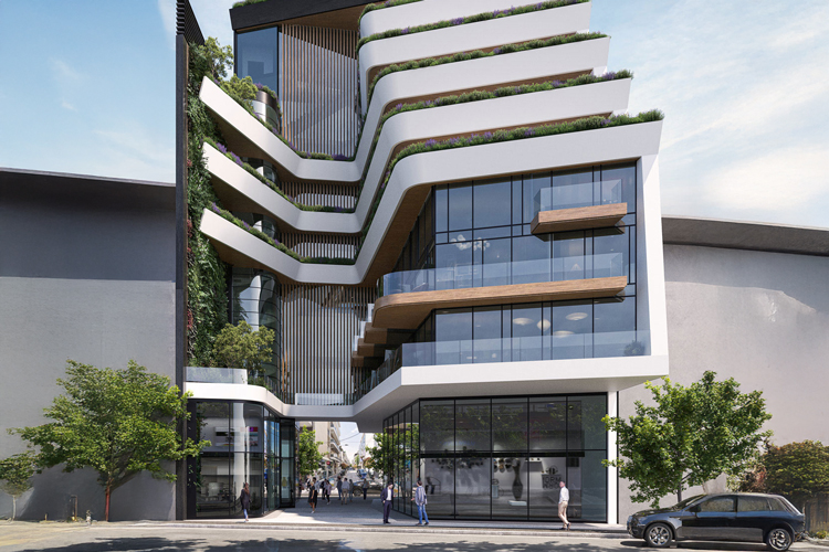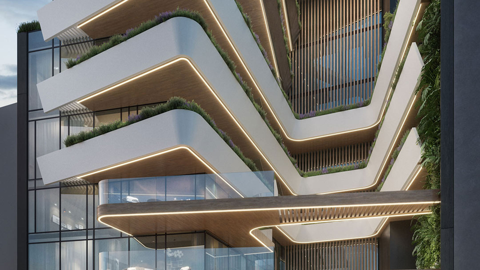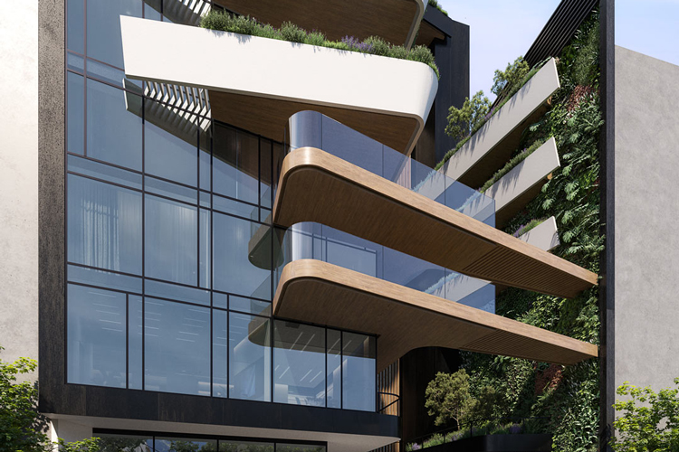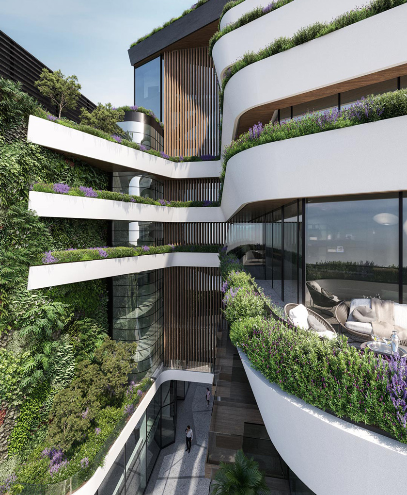 Featuring both apartments and commercial areas, a priority was to ensure that everyone in the building had an open view from their apartment. Biophilic design was central to delivering this, with key features such as the creation of a vertical garden ensuring direct experiences of nature. The other key focus was to ensure privacy for each resident. As such, vertical wooden slats provide shading for the communal area from the street, and staggered tilted balconies protrude from each level and also protect from street views.