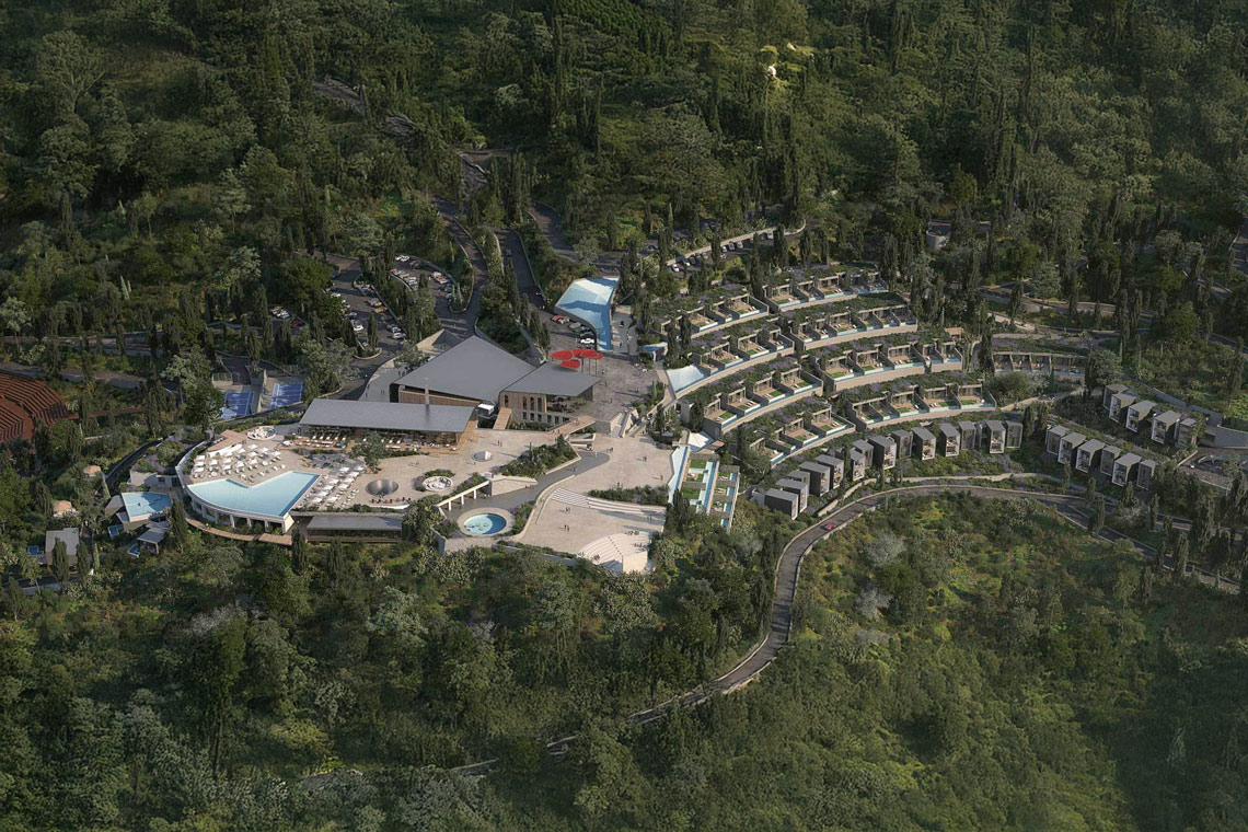 On the opposite side of the compound is the communal wellness area. Here, facilities including swimming pools, a fine dining restaurant and a 3500 capacity outdoor theatre immerse guests in the wellness experience. Open throughout the year, visitors can move between communal and private areas both via a system of pathways, and also through underground tunnels – which provide sheltered access to all the amenities for guests during the winter.