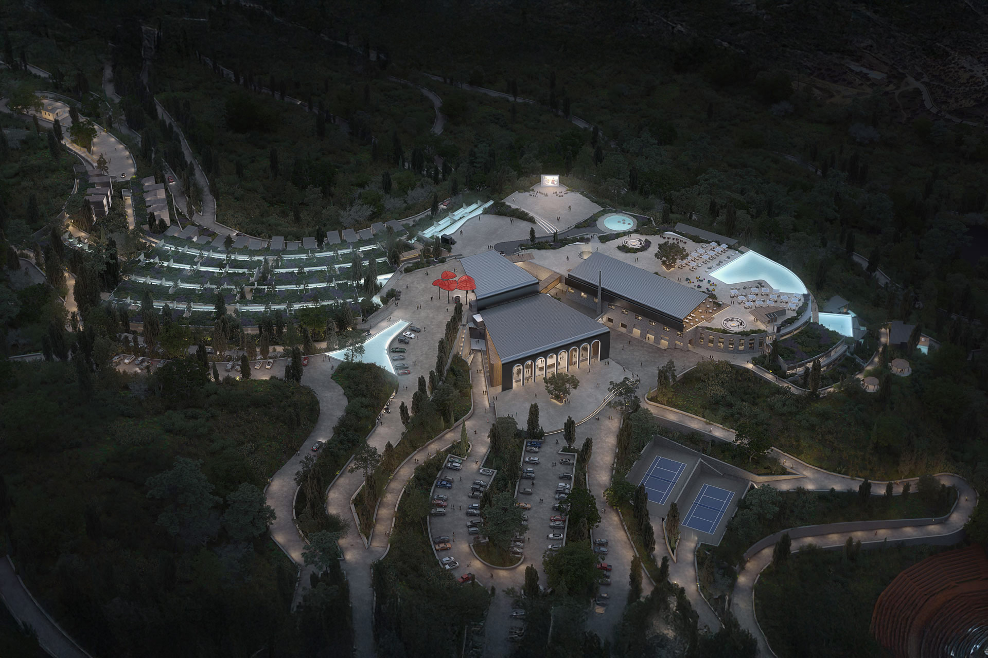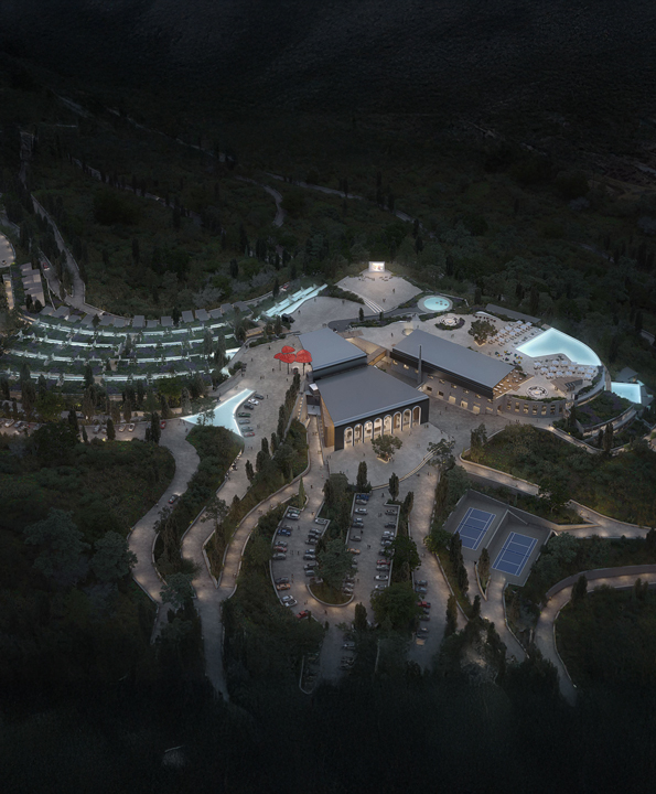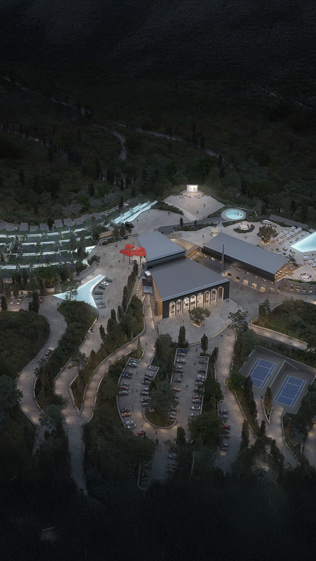 On the opposite side of the compound is the communal wellness area. Here, facilities including swimming pools, a fine dining restaurant and a 3500 capacity outdoor theatre immerse guests in the wellness experience. Open throughout the year, visitors can move between communal and private areas both via a system of pathways, and also through underground tunnels – which provide sheltered access to all the amenities for guests during the winter.