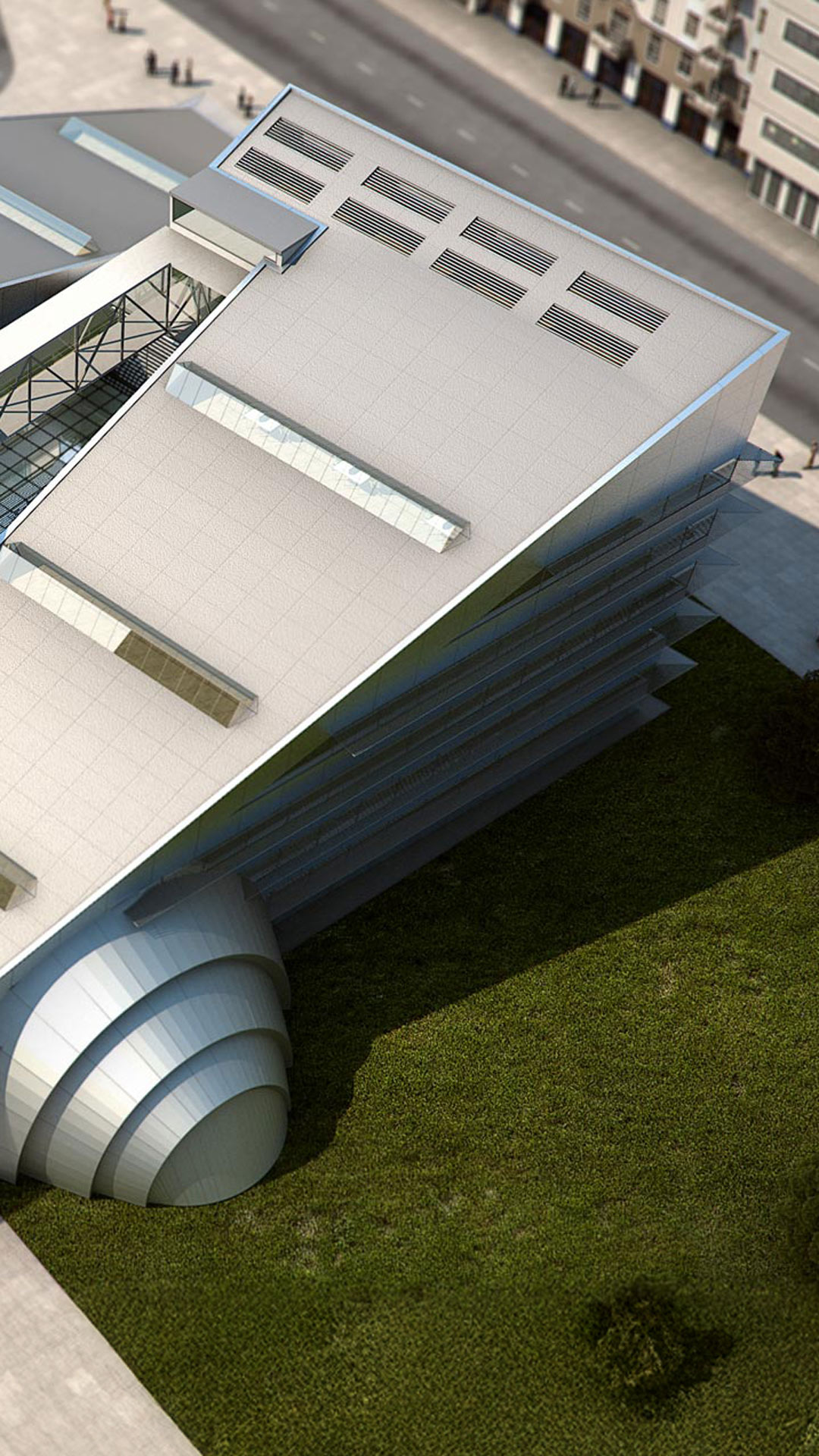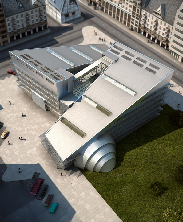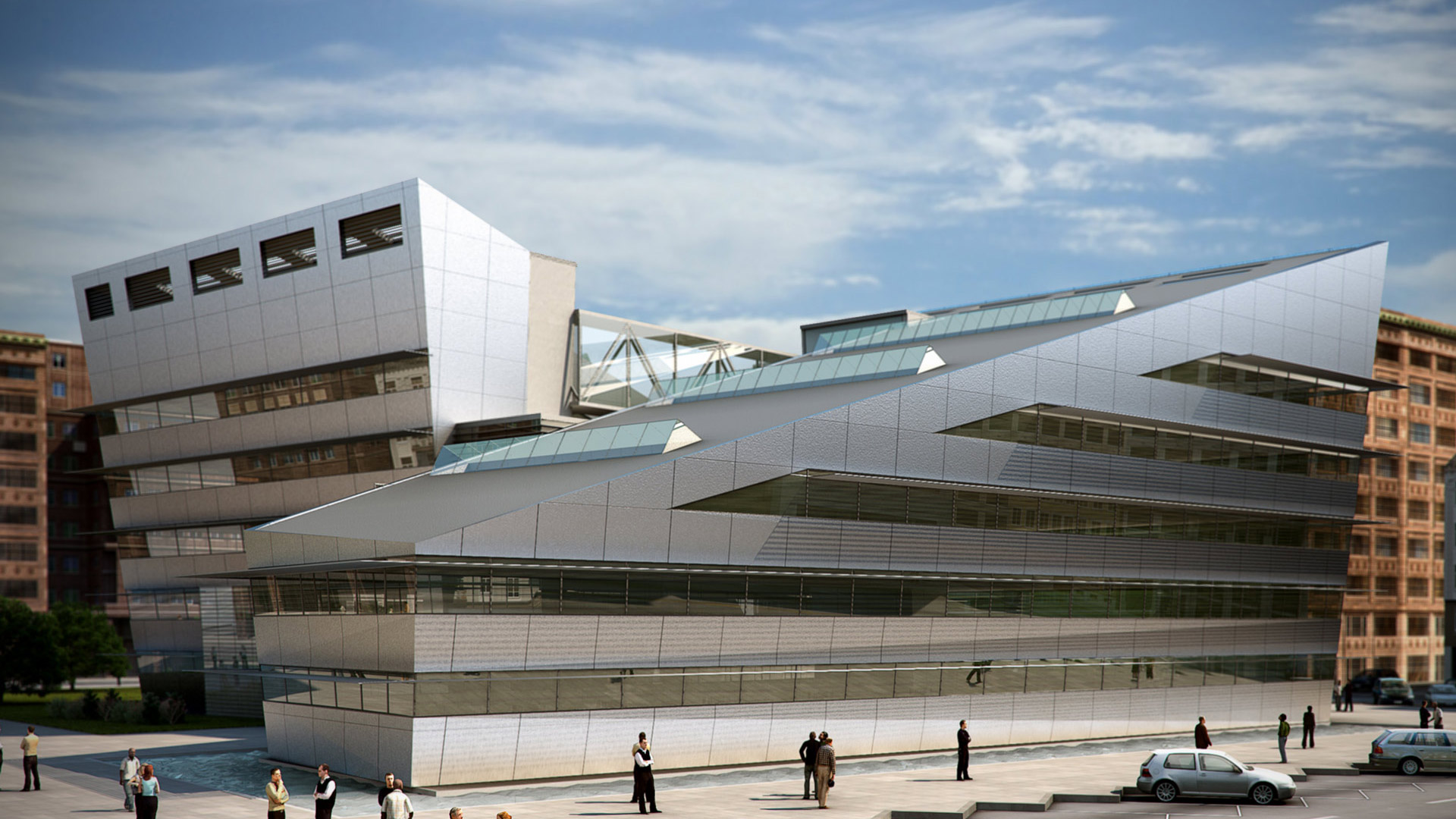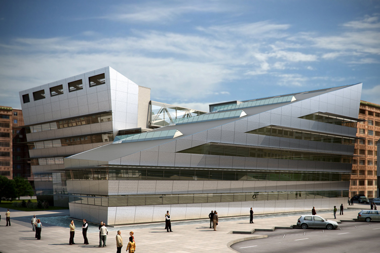 The site consists of two diametrically opposed volumes joined by an interior atrium. One side of the building functions as a conference hall, while offices are on the other side. An aluminium and mirrored facade embeds the building into the local environment, reflecting the surrounding area out across the square. On each volume, rectangular windows cut across the sloped roofs allowing for controlled entrance of natural light throughout the interior. On the south elevation of the building, a further shading system serves to regulate the amount of direct sunlight into the atrium.
