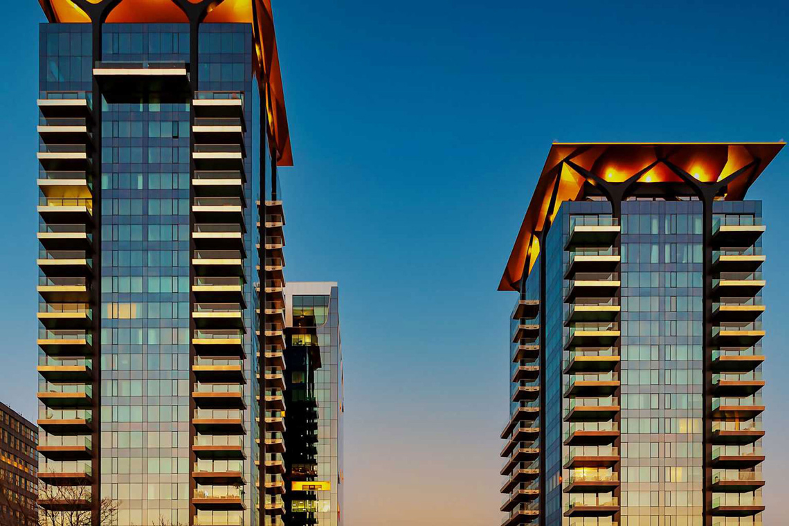 The residential buildings are immediately distinct, courtesy of gold panelled canopies which situate the glass building facades within a rich context. The residential towers consist of two 15 storey and one 18 storey building, which feature 247 apartments in total. Enveloped by an advanced curtain wall system, floor to ceiling glazing enables bountiful views from each apartment. Each apartment features at least one silver balcony that reflects the surrounding area.