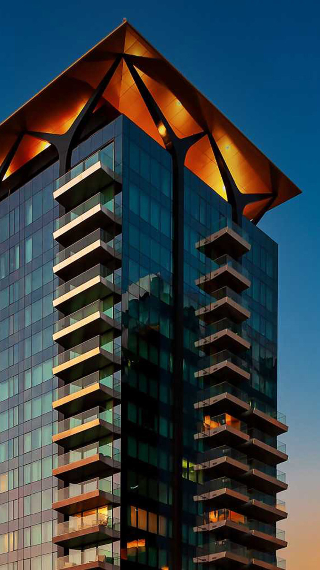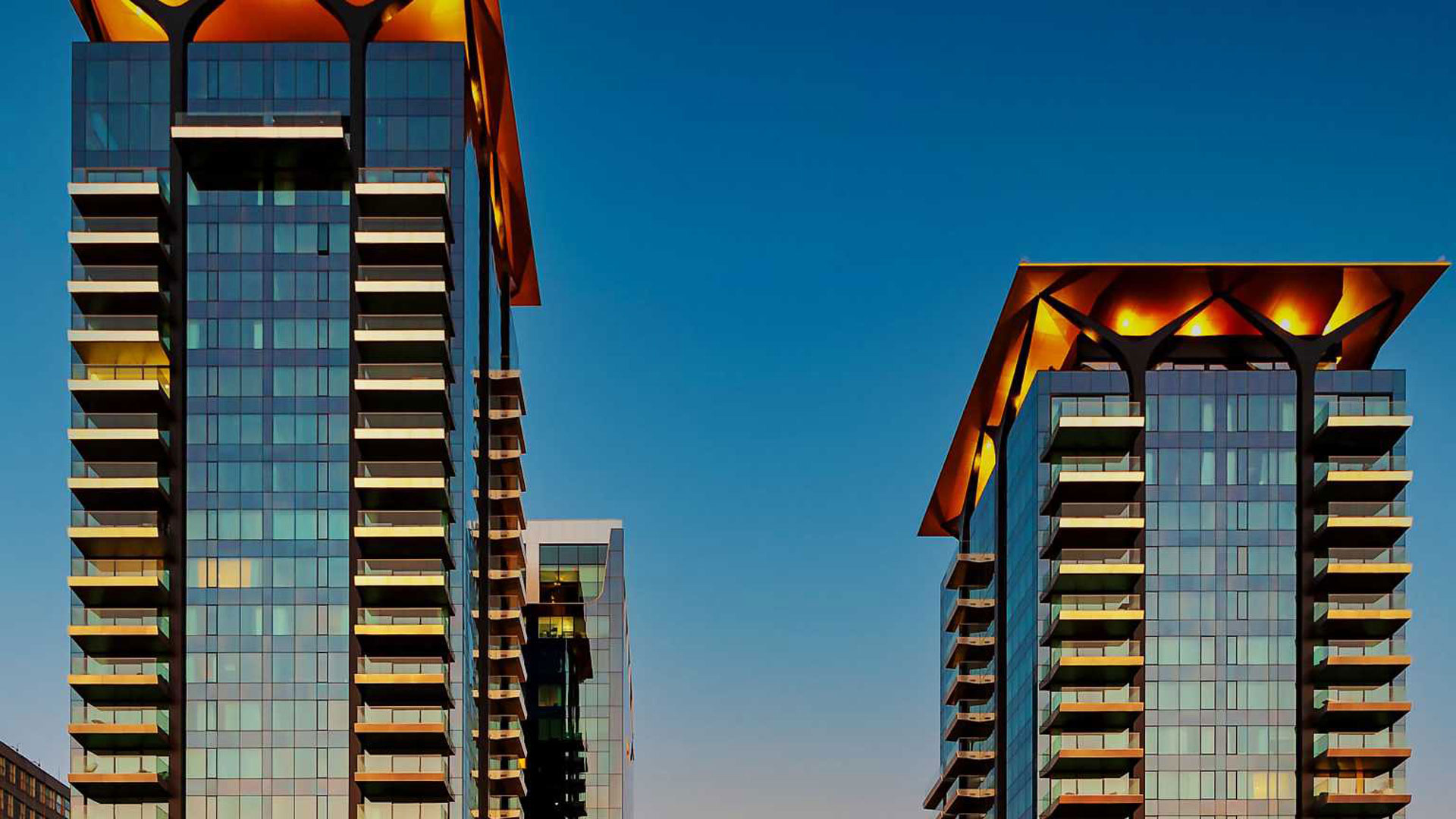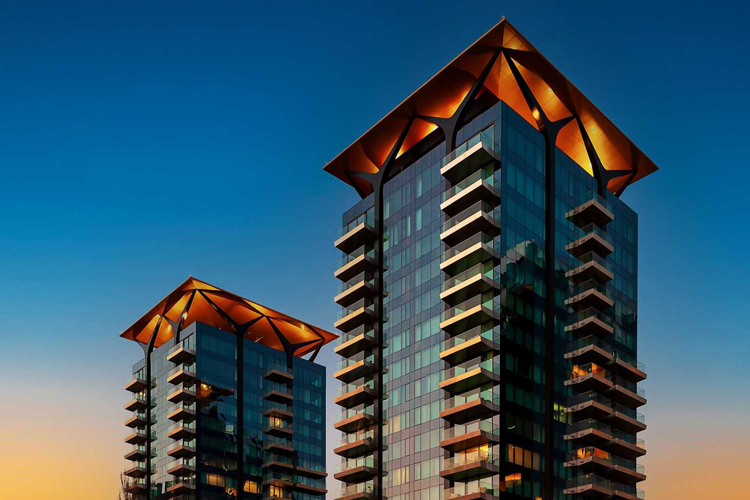 The residential buildings are immediately distinct, courtesy of gold panelled canopies which situate the glass building facades within a rich context. The residential towers consist of two 15 storey and one 18 storey building, which feature 247 apartments in total. Enveloped by an advanced curtain wall system, floor to ceiling glazing enables bountiful views from each apartment. Each apartment features at least one silver balcony that reflects the surrounding area.