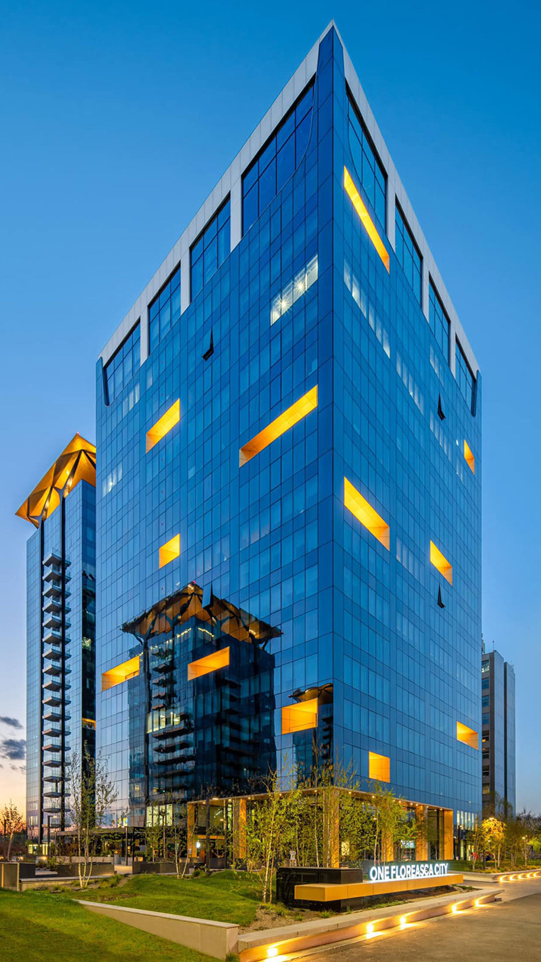 While set apart from the residential towers, the office building is in synergy with the rest of the site, with key design features replicated throughout. Intruding balconies cut into the exterior of the facade, with the alcoves also created from aluminium material. Each level features at least two openings to optimise a sense of light and space, and on the roof there is a commercial area enclosed by a golden canopy. Responding to the needs of modern times, “One Tower” is one of the most sustainable office buildings in Bucharest, pre-certified for LEED Platinum V4