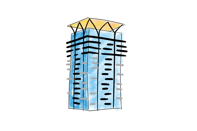 On the exteriors, a distinctive Y element made from steel supports the golden canopies on the roof. The Y element is an extension to the existing structure of the building, supporting the perimetrical columns of the building. These elements run from north to south on the facade, also serving as drainage systems to take water from the roof.