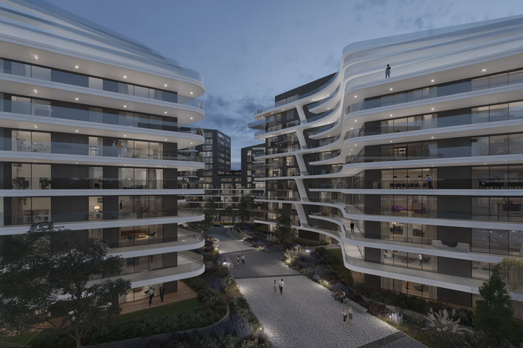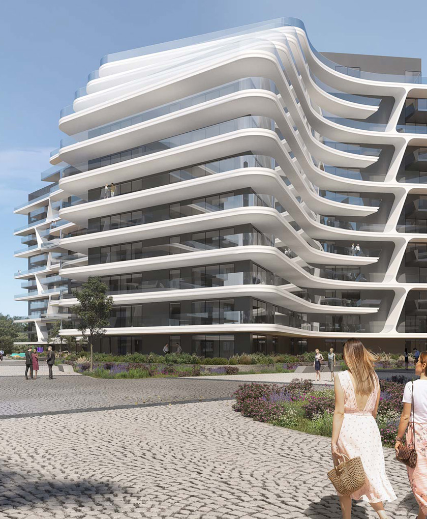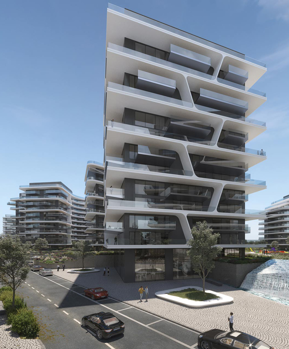 In version one of the project, a unified overall vision is composed through distinct structural forms. The ‘towers’ include polygonal parapets on the balconies, which act as a privacy screen between different apartments; a dual rectangular design features an open air atrium; and curved buildings of single or three winged forms, which sit along the lakefront. In version two, a central building is rendered through two curved structures to create an ‘O’ shape.