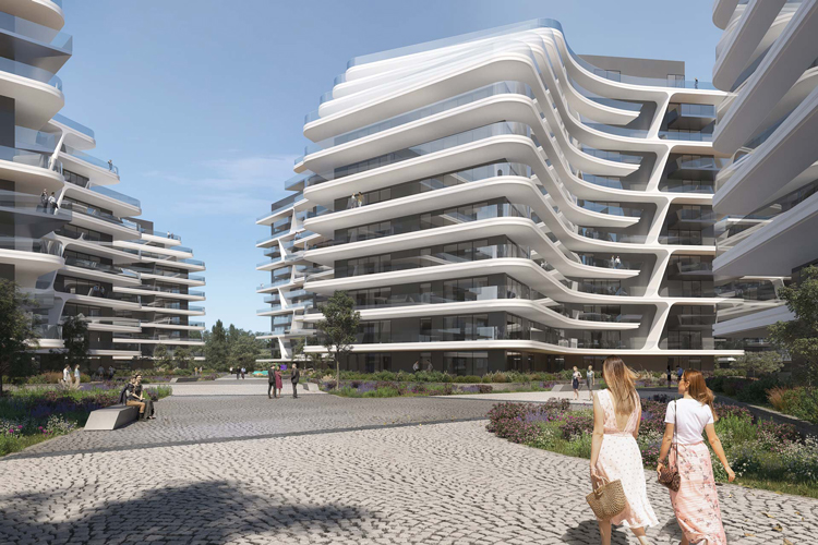 In the both versions, structural ingenuity ensures that openings facilitate access to views of the lake across the design, not only in the apartments closest to the water. Meanwhile communal piazzas include water features and beds of wildflowers to bring natural elements into the heart of residential life.