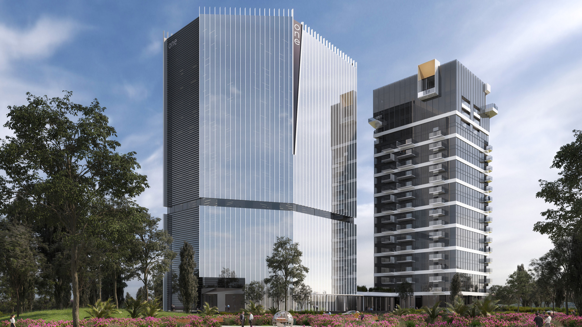 Though distinct from each other, a conversation between the two buildings is suggested through the use of vertical glass panels that frame the upper levels of each site. At 16 storeys, the first building is defined by its louvred side of the facade. The interruptions of the glass facade express the character of the building.