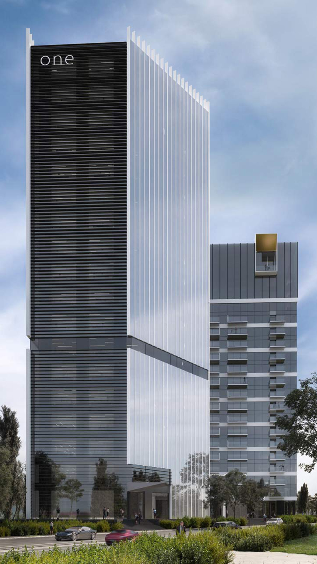 The second building builds on the existing aesthetic language of the One United Properties buildings throughout the city, reflecting Bobotis+Bobotis previous work on One Floreasca City. For example, gold aluminium panels punctuate balconies that are distributed on either side of the tower. The delicacy of the glass is subverted through the solidity of the exterior details. Continuous white aluminium bands wrap horizontally around each storey, while square balconies protrude from every floor.