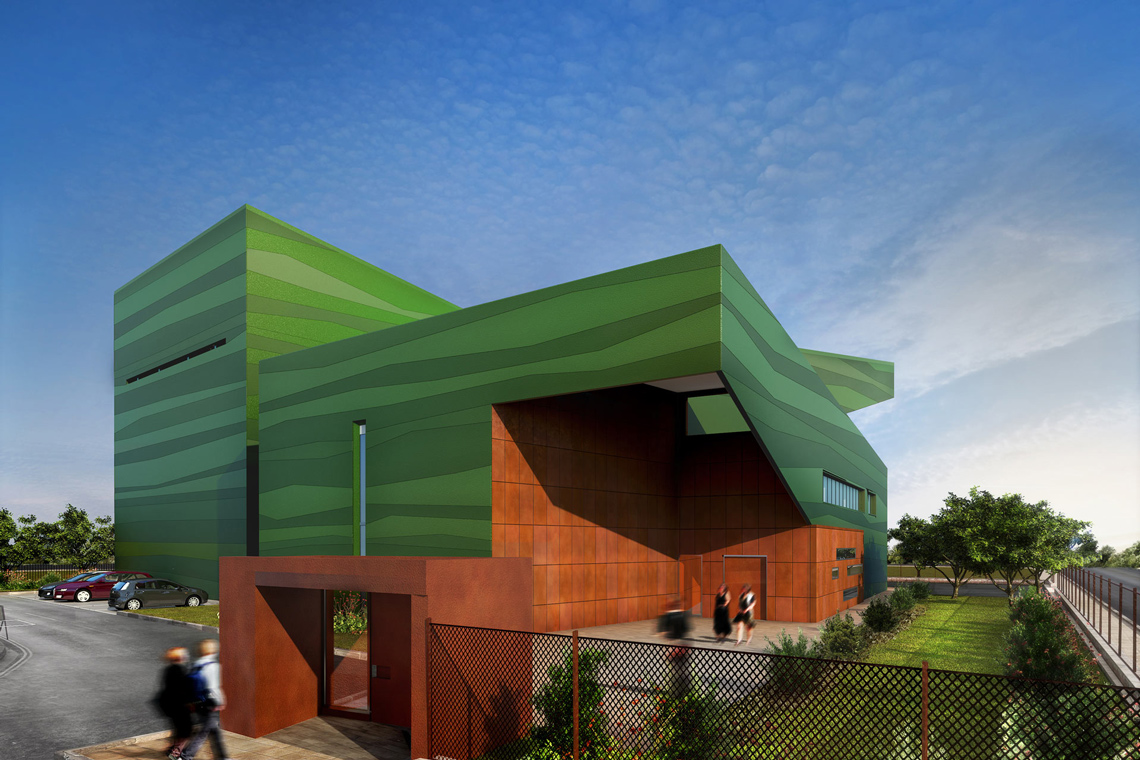 Two versions of the building are proposed. For each, the exterior is created from a honeycomb system: the green version is honeycomb panels with an external aluminium layer combined with a corten underbelly; the white version is the same honeycomb and aluminium panels, supported by a wooden base. On both versions, solar panels power the everyday needs of the building and generate a sustainable preservation system.