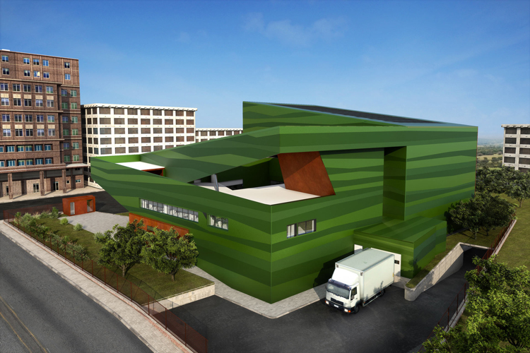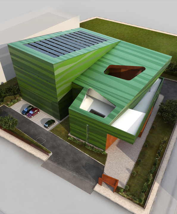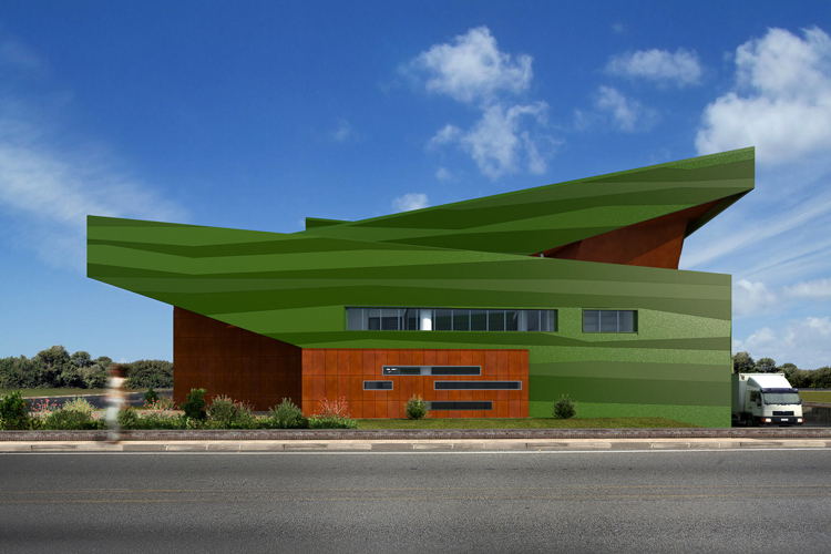 Two versions of the building are proposed. For each, the exterior is created from a honeycomb system: the green version is honeycomb panels with an external aluminium layer combined with a corten underbelly; the white version is the same honeycomb and aluminium panels, supported by a wooden base. On both versions, solar panels power the everyday needs of the building and generate a sustainable preservation system.