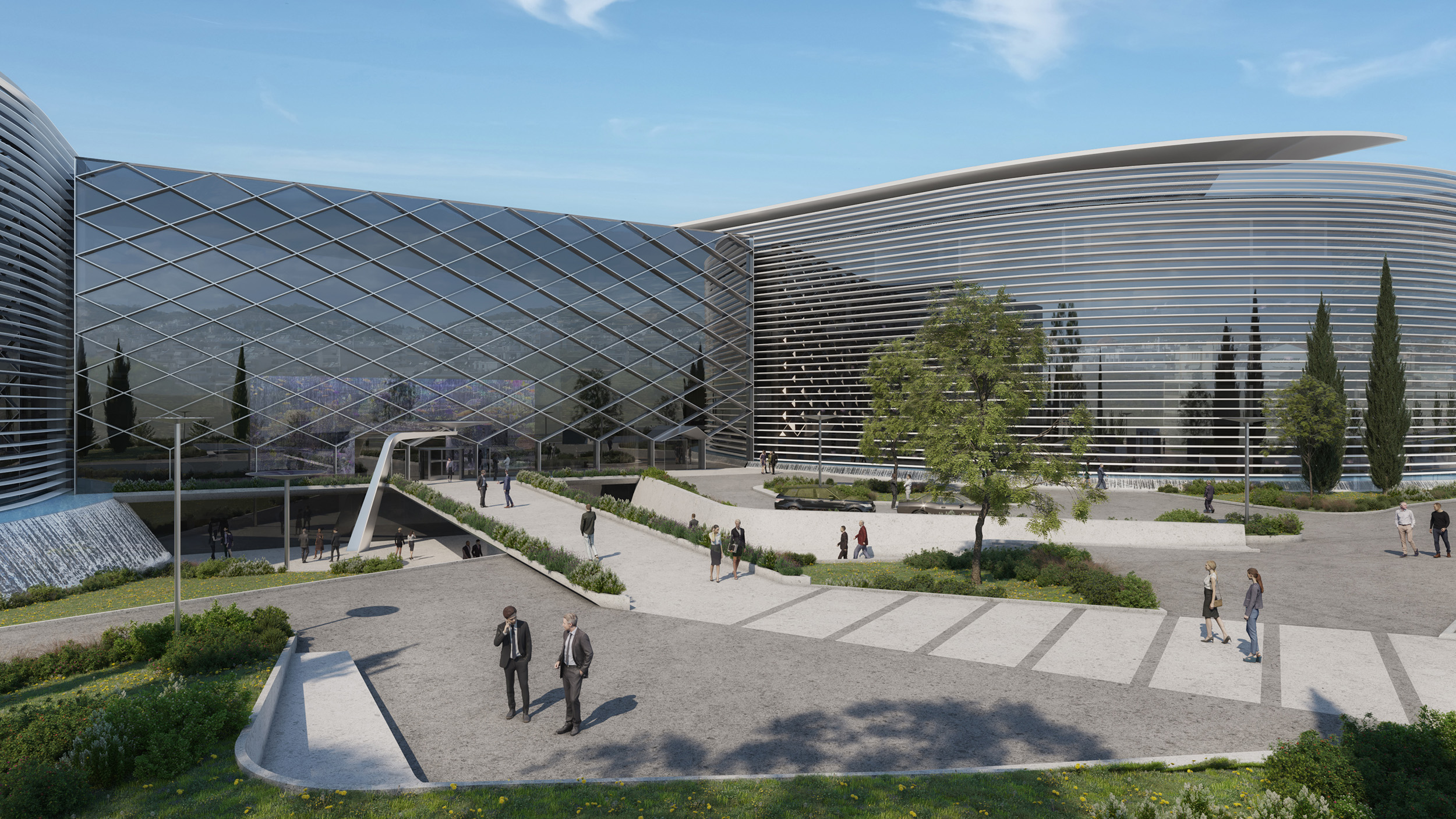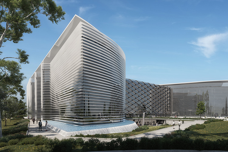 Featuring a modern glass exterior, three parts of the building are arranged in symmetry. The central rectangular central form is fronted by a steel lattice. This main structure anchors the building’s two wings, which feature curved facades that stretch out around the forecourt. Louvres surround the whole body of the building to regulate the impact of sunlight. On the roof, the curved canopy is lined with solar panels to organically power the everyday needs of the company. Traffic regulation is also addressed through the introduction of four entrances and exits for cars via the underground parking, which can be altered as needed to manage congestion during busier periods.