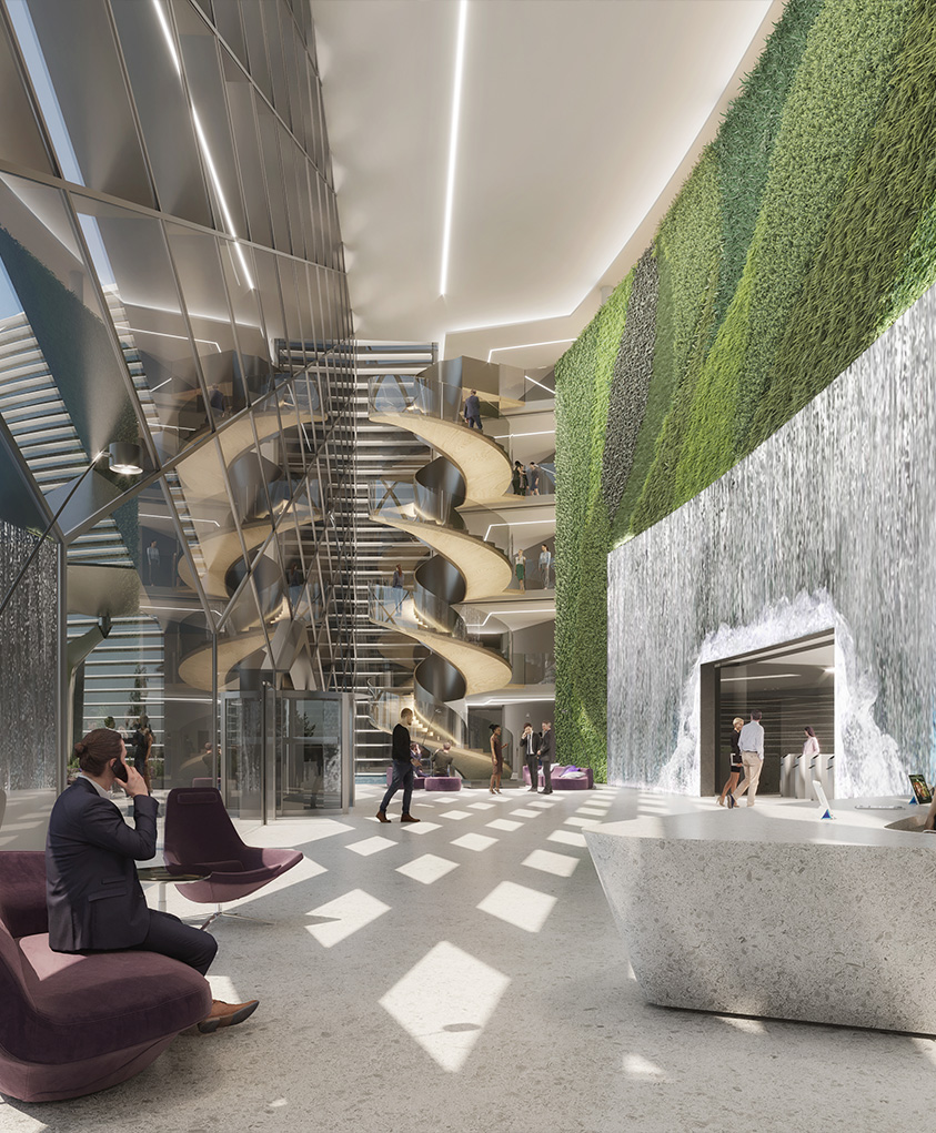 Inside, a full height lobby reflects the ecological principles of the design. Here, walls lined with greenery compliment a projection of running water across an expansive wall. The greenery also masks technical infrastructural elements that sit behind it. Light floods the interior though the lattice structure, and a striking spiral staircase encourages healthy living.