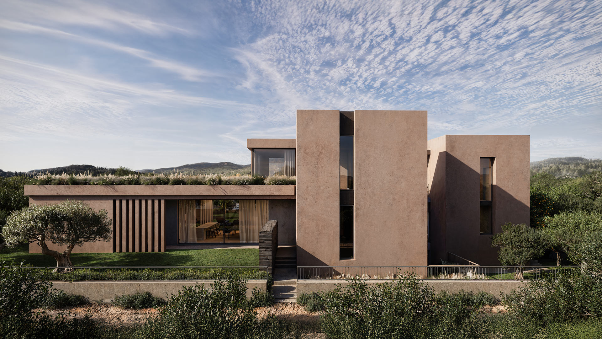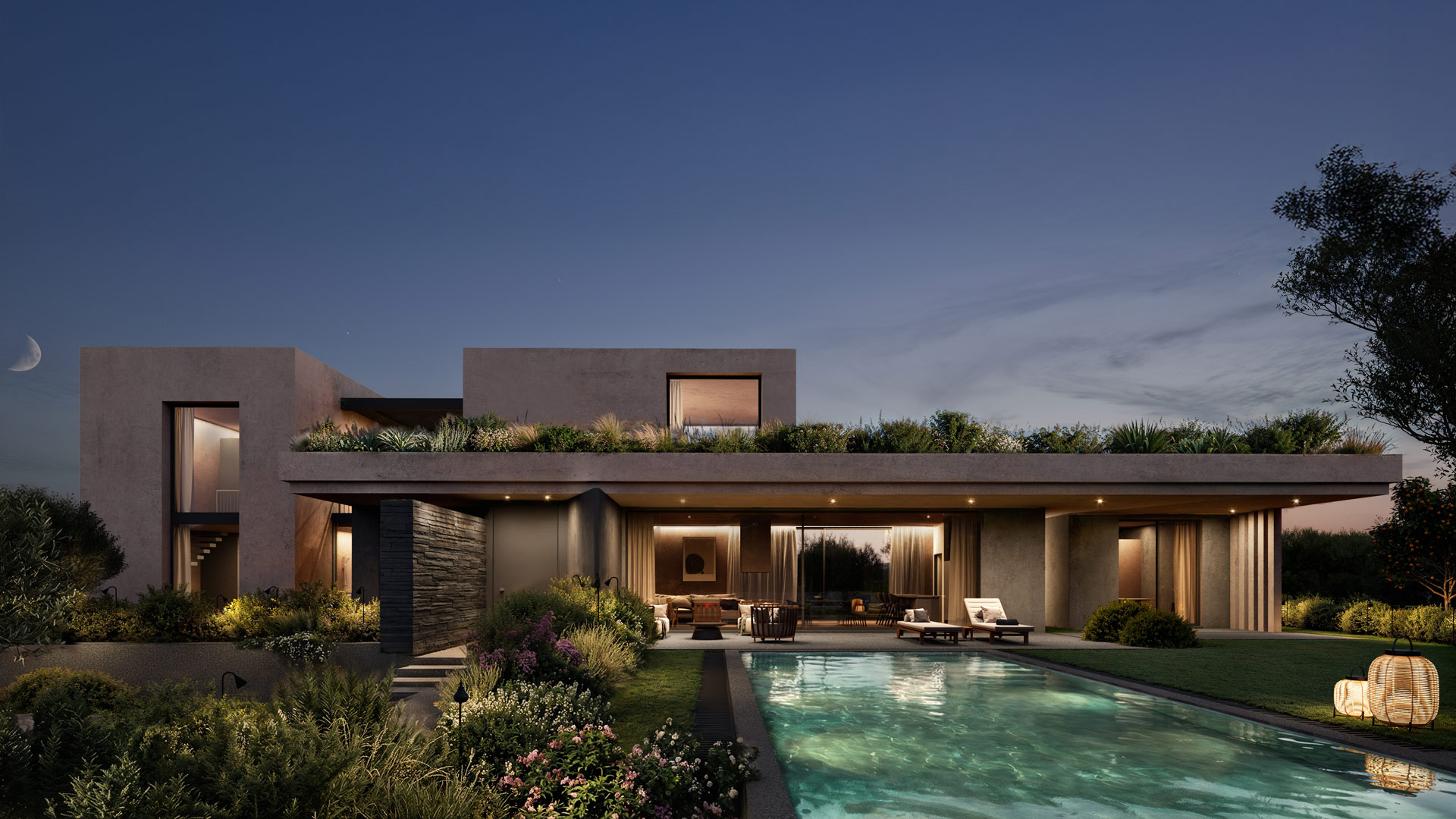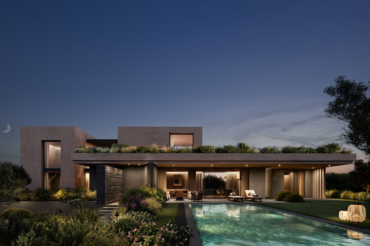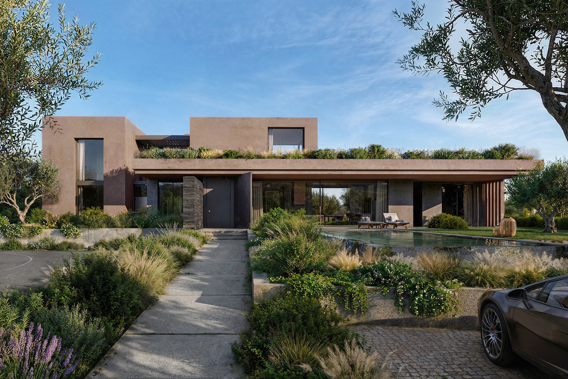 The outdoor layout follows a balanced composition, with the swimming pool and a small basketball court positioned symmetrically alongside the main volumes, reinforcing a sense of order and calm within the landscape.