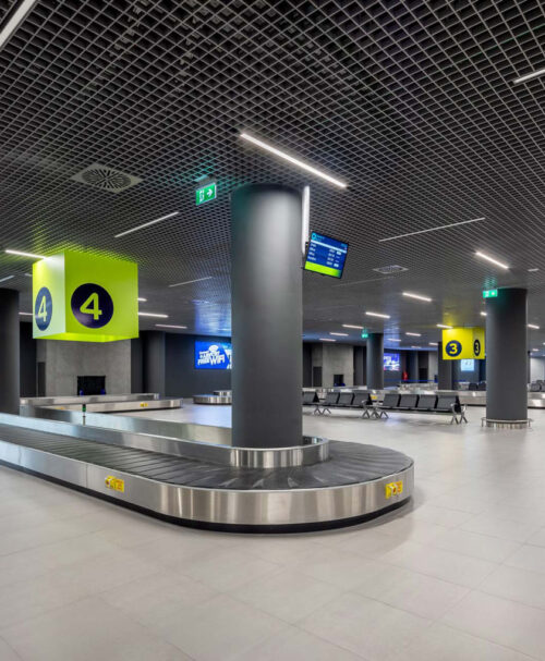 The design is delivered within strict and specific regulations, ensuring that the interiors are heavily insulated against outside noise. To do this, a custom facade system was designed. Such insulation allows for the free flow of natural light that enters and fills the building.Well proportioned check in areas and baggage claim also emphasise the spaciousness of the interior.
