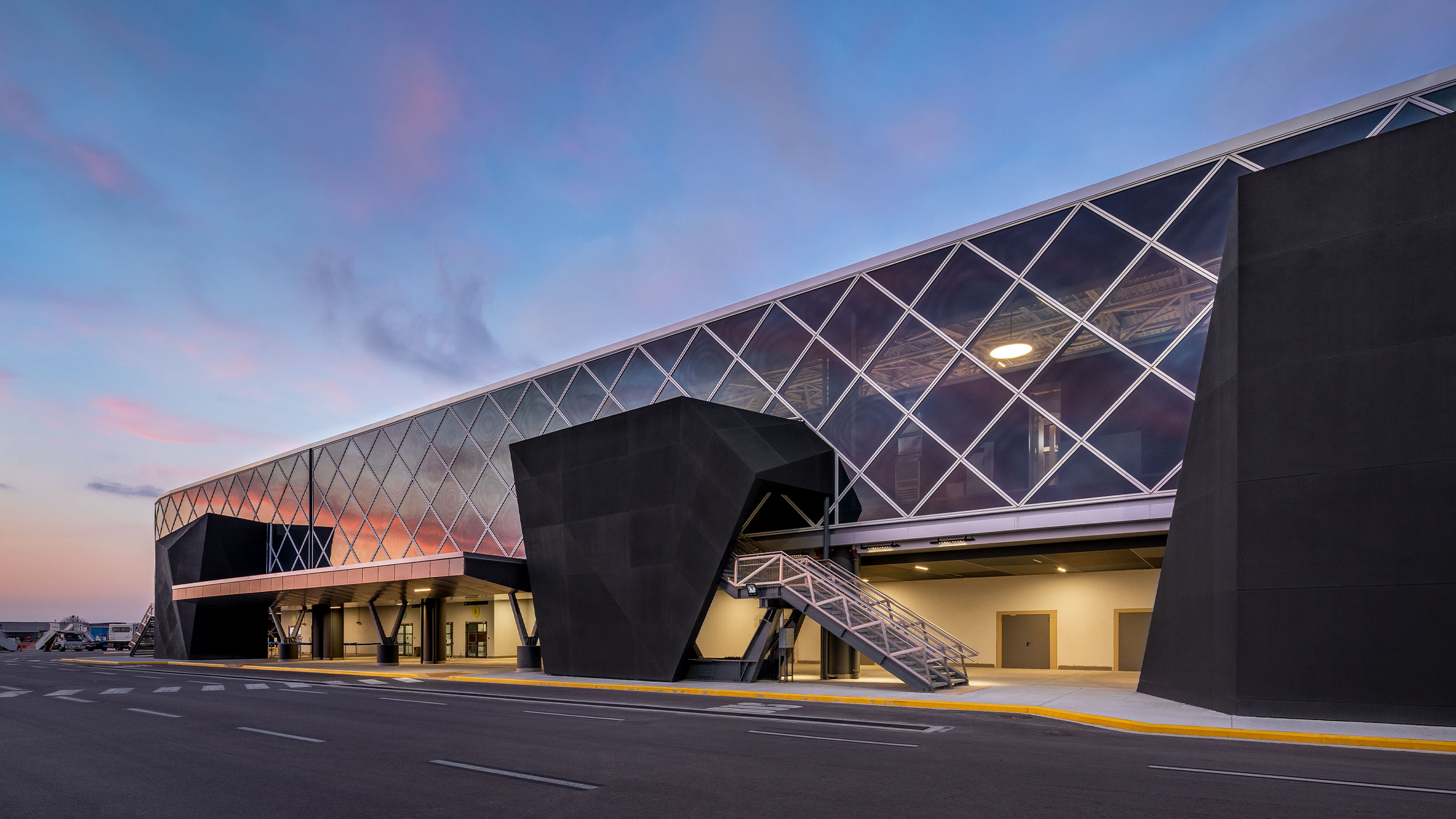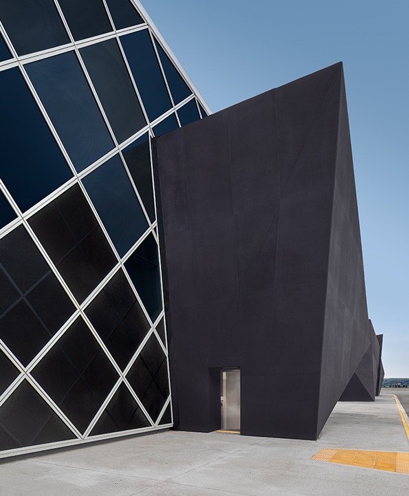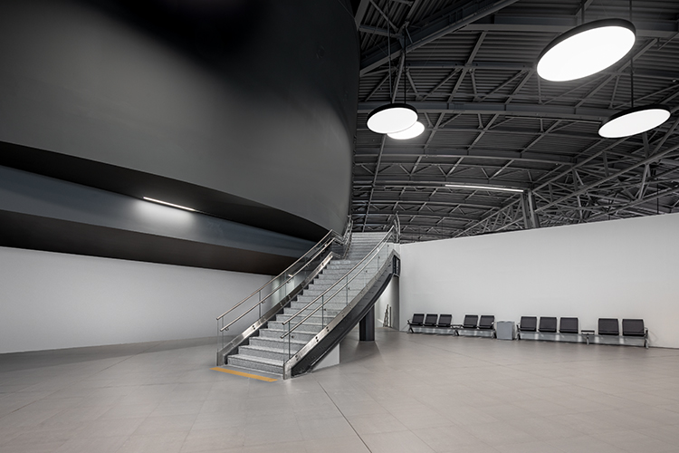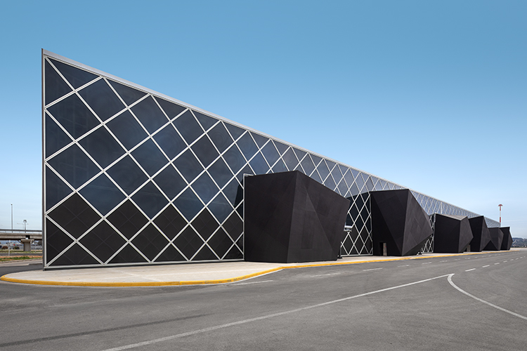 At 32,000 sqm, the site is enveloped by a glass facade. On this simple surface, lattice detail runs across the exterior. Matt black gate exits are housed within idiosyncratic forms created from honeycomb aluminum panels, which sit on the airside of the terminal building . Meanwhile, a series of interior footbridges seamlessly connect the terminal buildings.