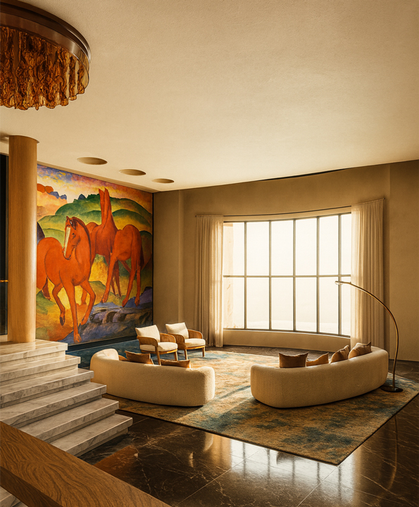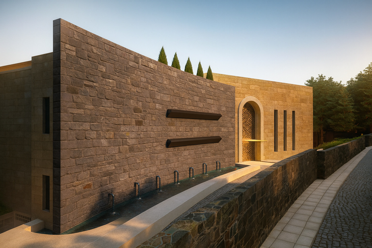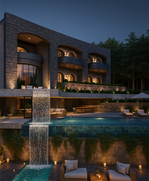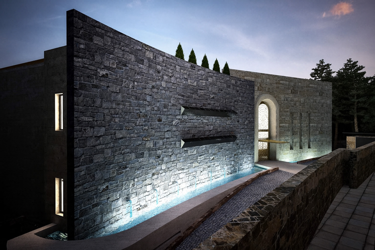 Inside, bedrooms are demarcated by arch entrances, allowing for a free flow between the rooms and between bedrooms and bathrooms. In each bedroom, custom-made wooden wardrobes, wooden beams and engraved wooden slat details bring textural warmth that compliments stone walls and floors.