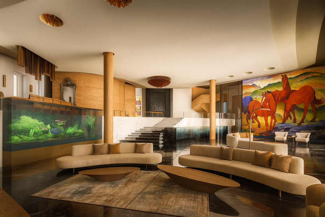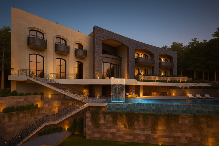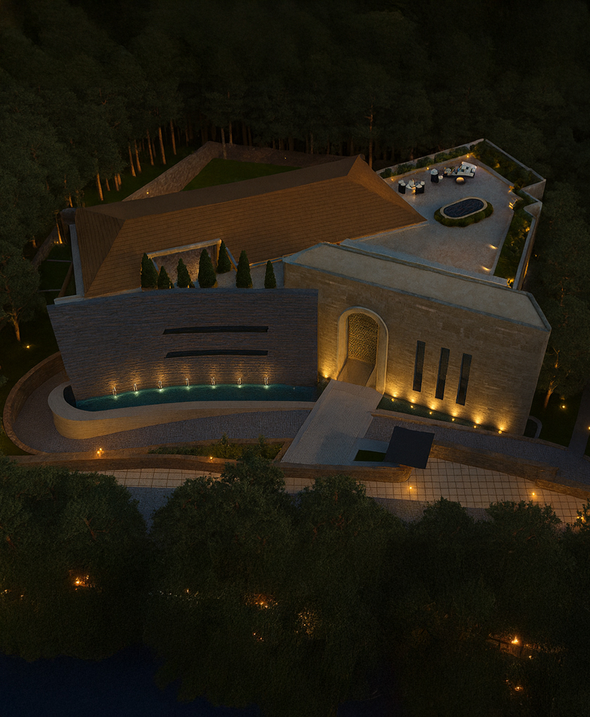 The villa itself consists of three levels, featuring bedrooms, indoor and outdoor kitchens and living rooms, as well as a swimming pool, outdoor bar and fire pit. At the main entrance, celosia panels on the wall have been used to bring warmth into the night, with the open terracotta brick allowing light to filter through. Corten clad door frames protrude from the facade of the villa, the rust-coloured frames evoking the natural surroundings.