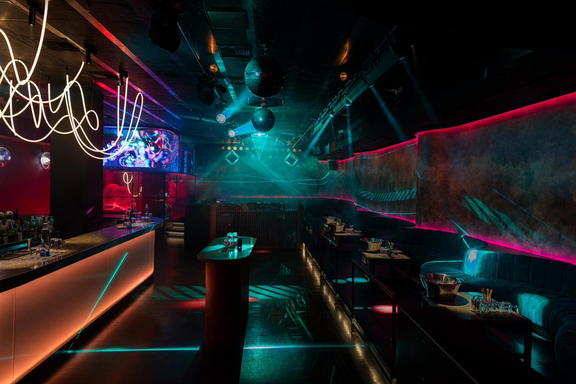 The entrance of Zelus is a stripped back atrium decorated with cotto tiles and latticed stone walls, the minimalist arrangement serving as a sensory palette cleanser before entering the nightclub’s beating heart. Visitors are guided from the entrance into the bar by bespoke fluorescent light design, a feature that recurs throughout the interior.
