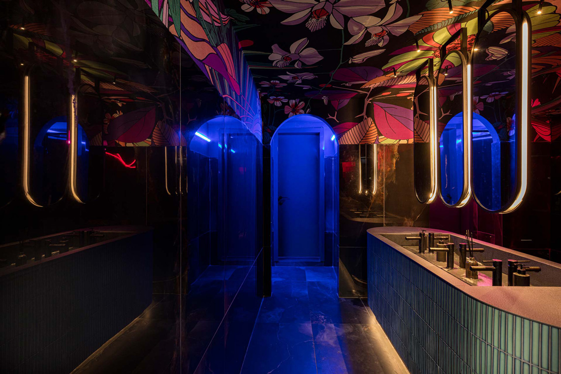 A glass corridor connects the central bar area to the bathrooms, and houses work by local artists on revolving display. In the bathrooms, freestanding sinks float next to onyx tiles, mirroring the futuristic effect of the main room. Similarly eclectic design on the bathroom ceiling echoes the light projections that take place on the dancefloor.