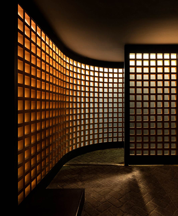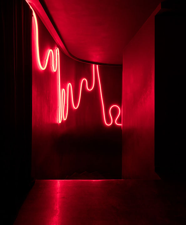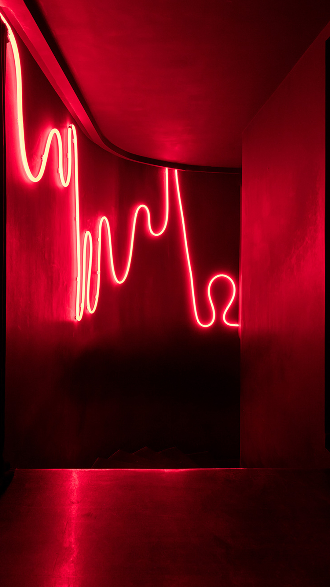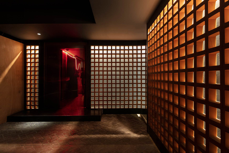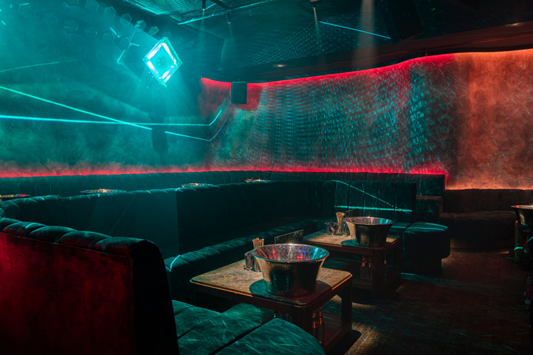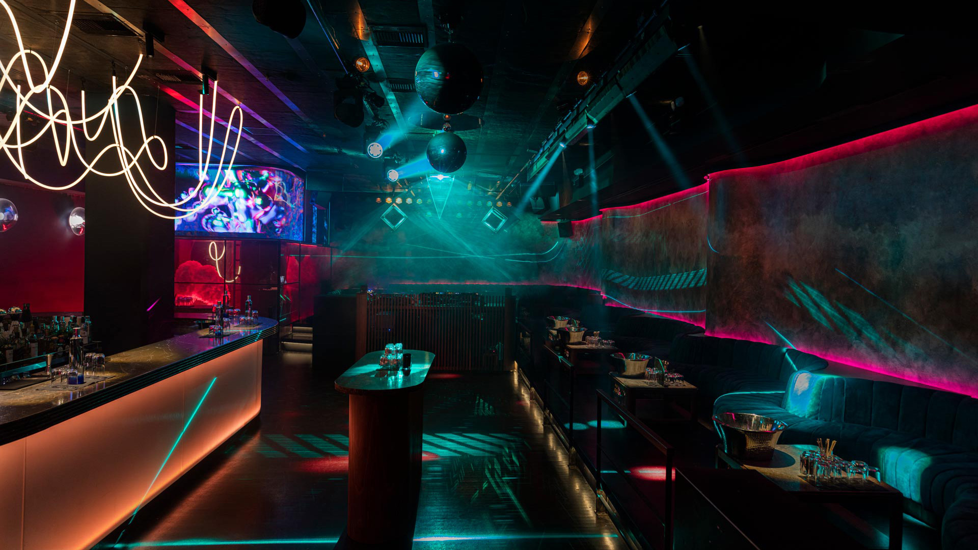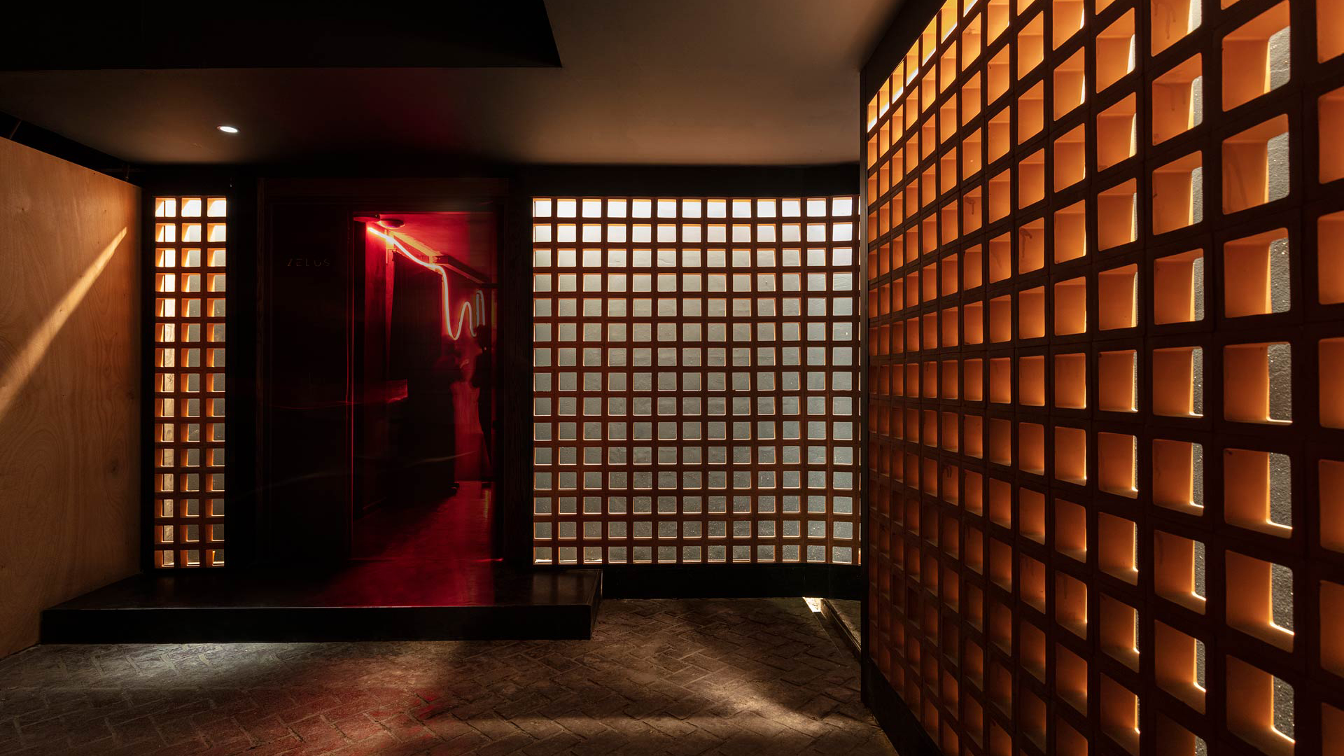 The entrance of Zelus is a stripped back atrium decorated with cotto tiles and latticed stone walls, the minimalist arrangement serving as a sensory palette cleanser before entering the nightclub’s beating heart. Visitors are guided from the entrance into the bar by bespoke fluorescent light design, a feature that recurs throughout the interior.