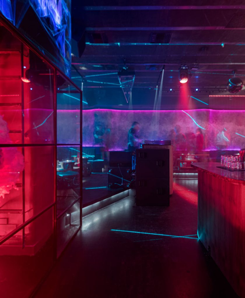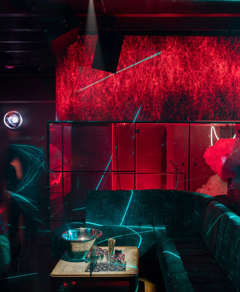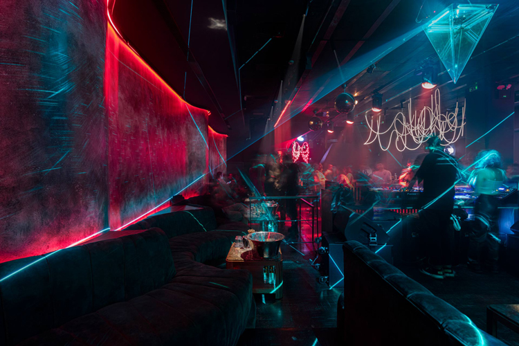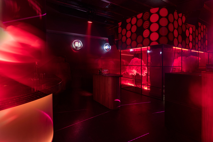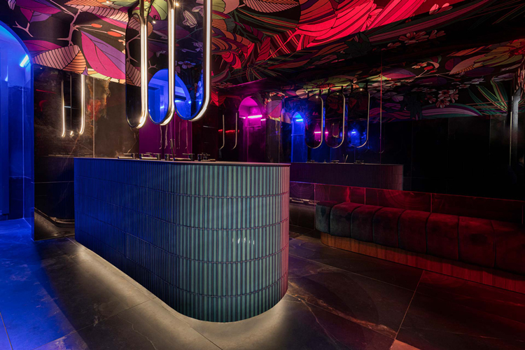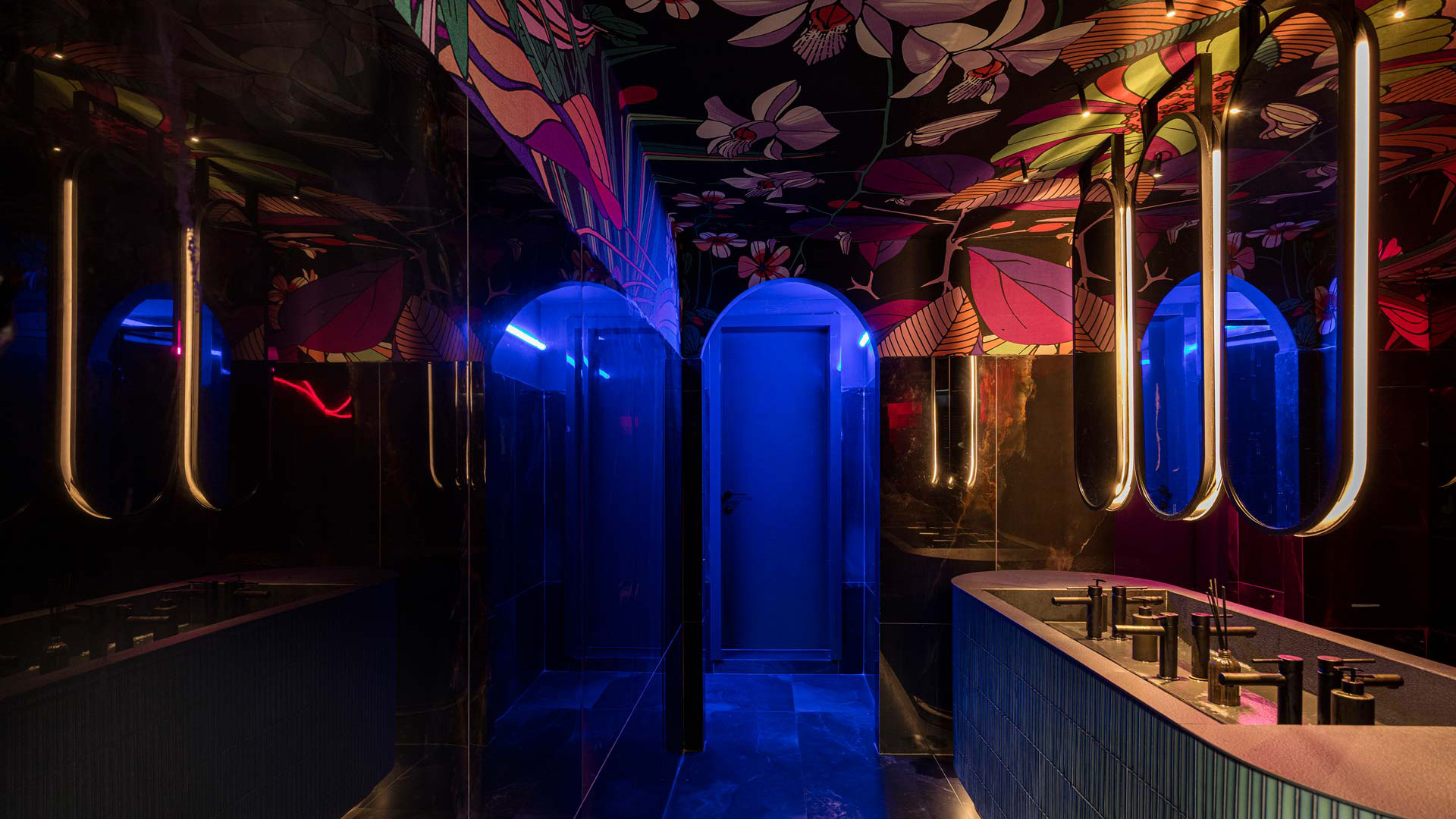 A glass corridor connects the central bar area to the bathrooms, and houses work by local artists on revolving display. In the bathrooms, freestanding sinks float next to onyx tiles, mirroring the futuristic effect of the main room. Similarly eclectic design on the bathroom ceiling echoes the light projections that take place on the dancefloor.