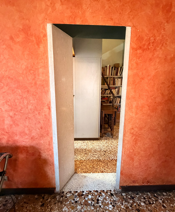 Furniture and fittings are deliberately non-invasive yet astonishingly precise: a suspended rotating service cart nests under the long dining table; a beautifully engineered timber lamp adjusts on cables; storage and work elements are modular, mobile, and often rotating.Circular “lunette” motifs recur—from a cylindrical kitchen pantry to a round shower—and even pierce ceilings to deliver daylight to the upper studio. As Barbara Pastor recalls, “everything in a space had to be modifiable, movable, and re-thinkable,” an ethos legible in the swiveling libraries, rolling units, and internal balconies that overlook the domestic microcosm below. Valeriano Pastor (1927–2023) was a Venetian architect and educator whose quiet rigor shaped the city’s late-20th-century architectural culture: a graduate and long-time professor at IUAV, he served as Rector from 1979 to 1982, mentoring generations around ideas of measured insertion and adaptable domestic space.