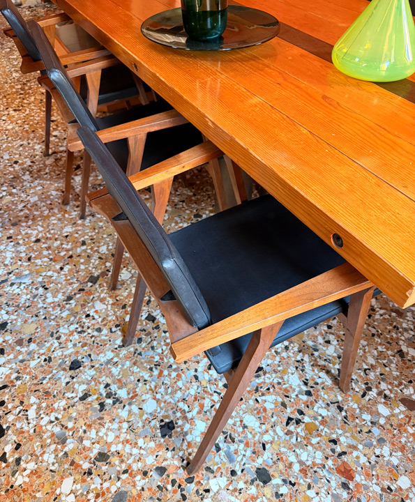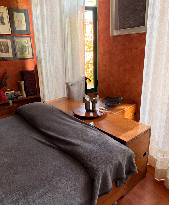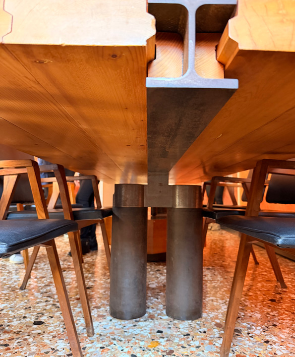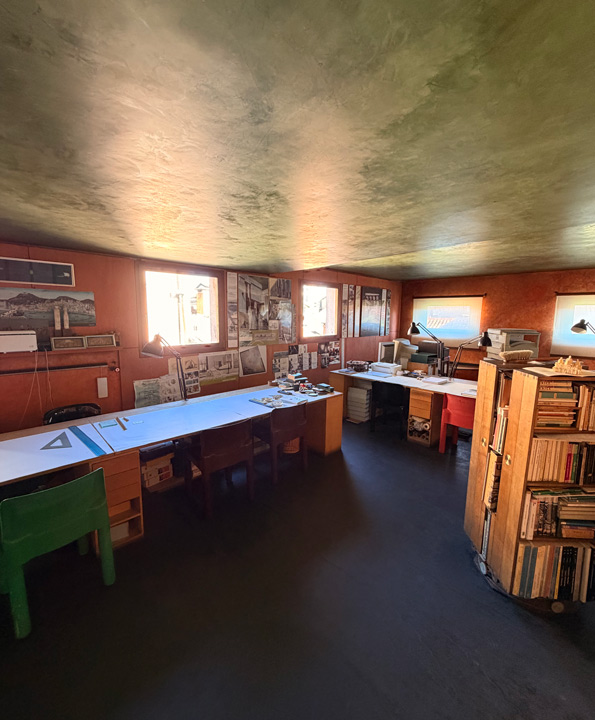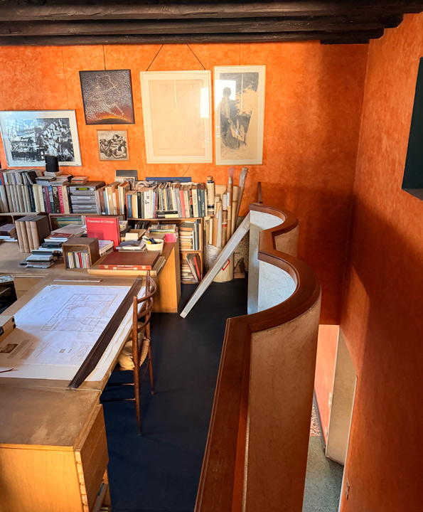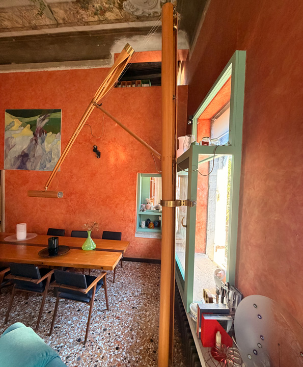Furniture and fittings are deliberately non-invasive yet astonishingly precise: a suspended rotating service cart nests under the long dining table; a beautifully engineered timber lamp adjusts on cables; storage and work elements are modular, mobile, and often rotating.Circular “lunette” motifs recur—from a cylindrical kitchen pantry to a round shower—and even pierce ceilings to deliver daylight to the upper studio. As Barbara Pastor recalls, “everything in a space had to be modifiable, movable, and re-thinkable,” an ethos legible in the swiveling libraries, rolling units, and internal balconies that overlook the domestic microcosm below. Valeriano Pastor (1927–2023) was a Venetian architect and educator whose quiet rigor shaped the city’s late-20th-century architectural culture: a graduate and long-time professor at IUAV, he served as Rector from 1979 to 1982, mentoring generations around ideas of measured insertion and adaptable domestic space.