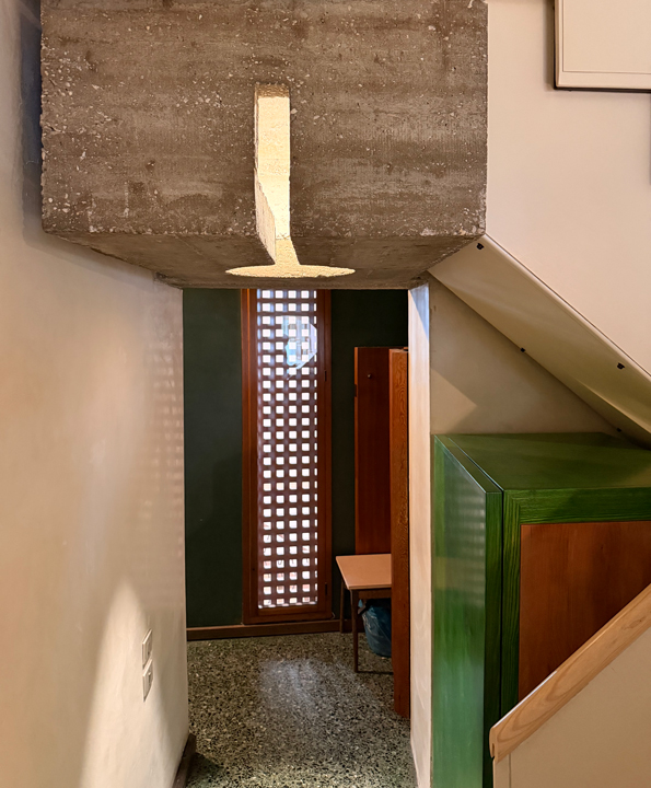 As part of a tour curated by True Design and Asset Interiors, we visited the third-floor west apartment of Palazzo Zacco overlooking the Rio di Santa Marina—home of architects Valeriano Pastor and Michelina Michelotto, refurbished in 1964–65. The dwelling is a lesson in Venetian verticality: slender “torrette” organize the tall entry, while stacked, extruded volumes interlock across three levels to reveal the plan as a spatial section.